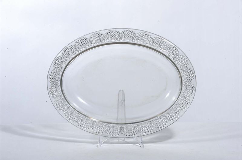 Giardiniera ovale in vetro incolore modellato entro stampo con decoro in rilievo. Firma a punte di diamante sotto la base. Modello creato nel 1934 e non continuato dopo il 1947. Lunghezza cm 43. Marcati segni di usura sotto la base.Bibl. F. Marcilhac, R. Lalique, Les editions de l'amateur, pag. 775 n. 10-3461