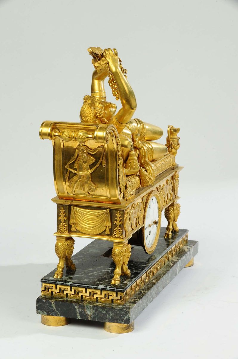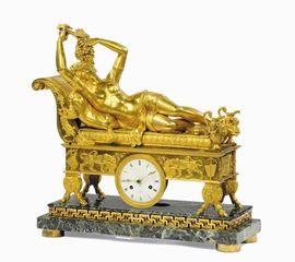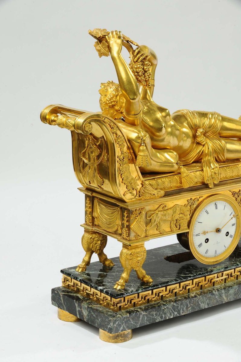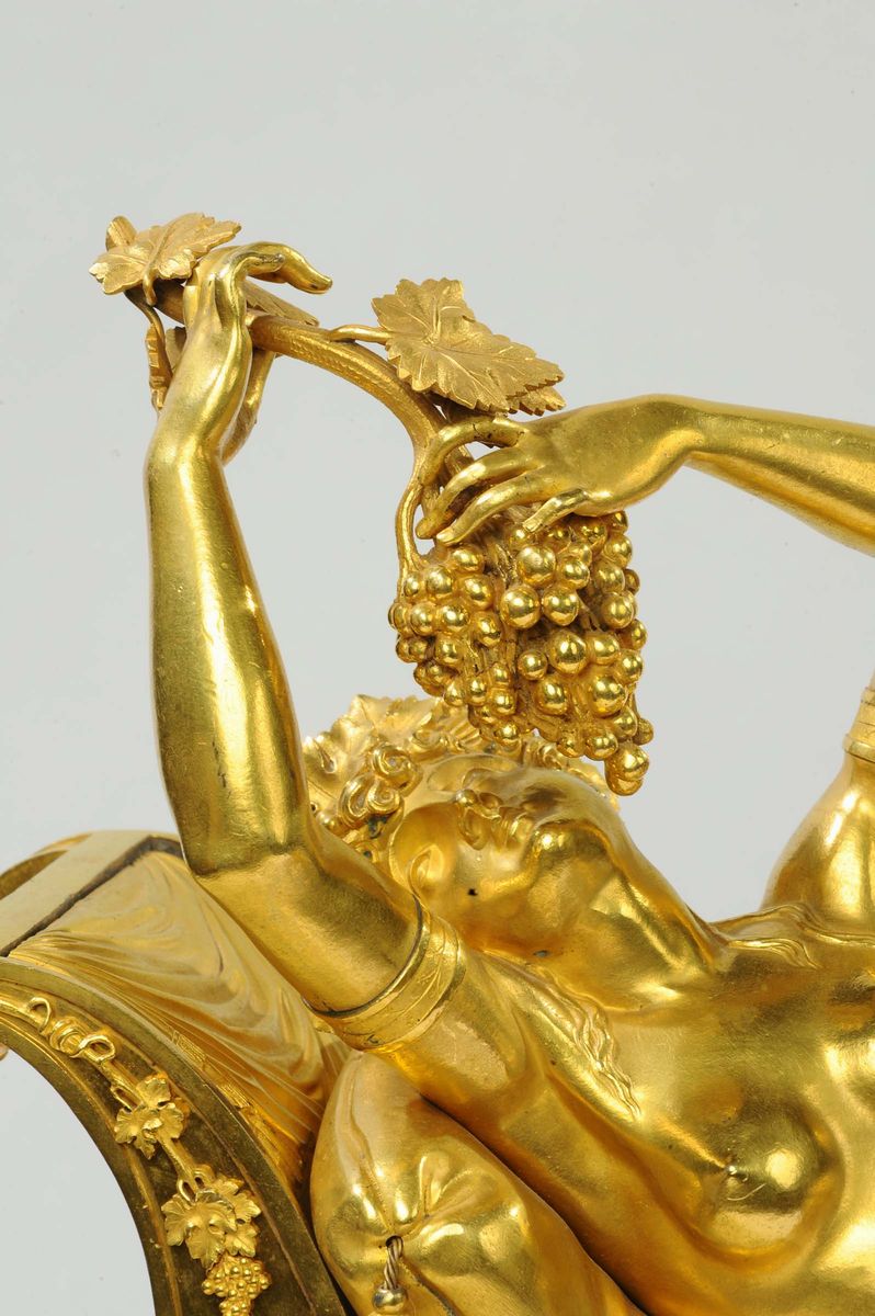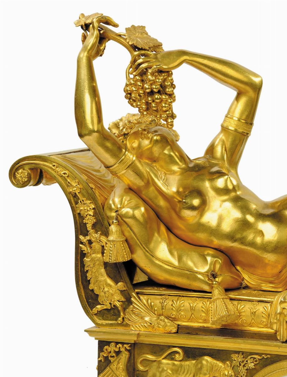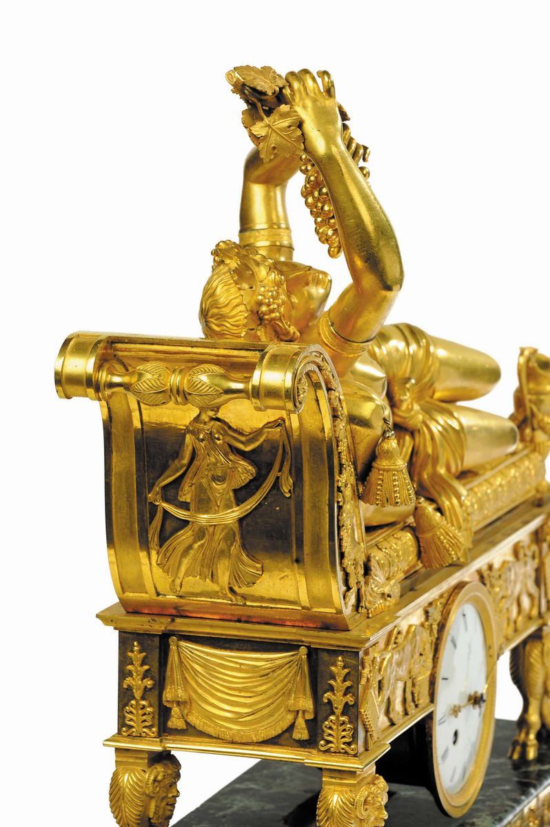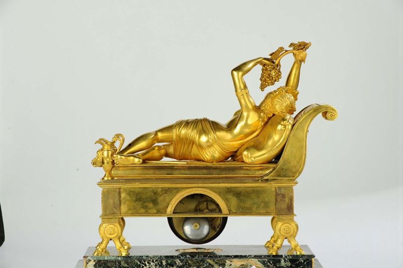 cm 51x18x50Quest’orologio di straordinaria qualità esecutoria mostra una sensuale baccante in procinto di assaporare i chicchi di un grappolo d’uva. La dovizia dei particolari, la profusione di ornamenti di bronzi collocano quest’opera in un ambito del bronzista Ravrio. Le dimensioni di quest’orologio sono tra l’altro ragguardevoli se comparato a soggetti somiglianti apparsi sul mercato antiquario.