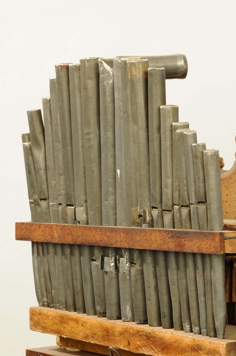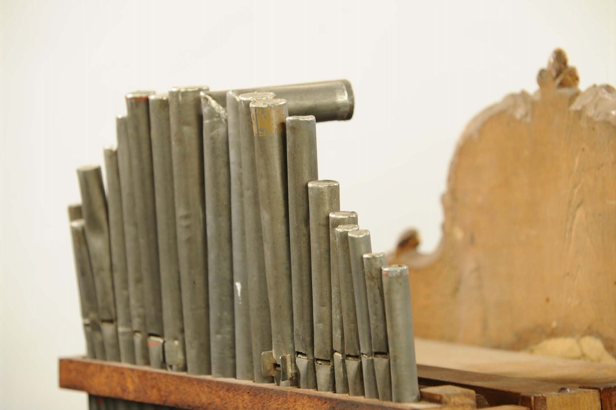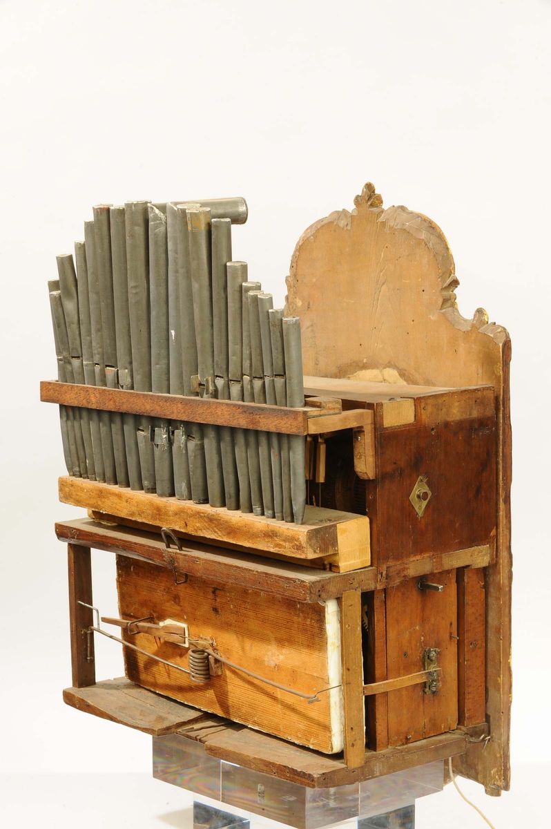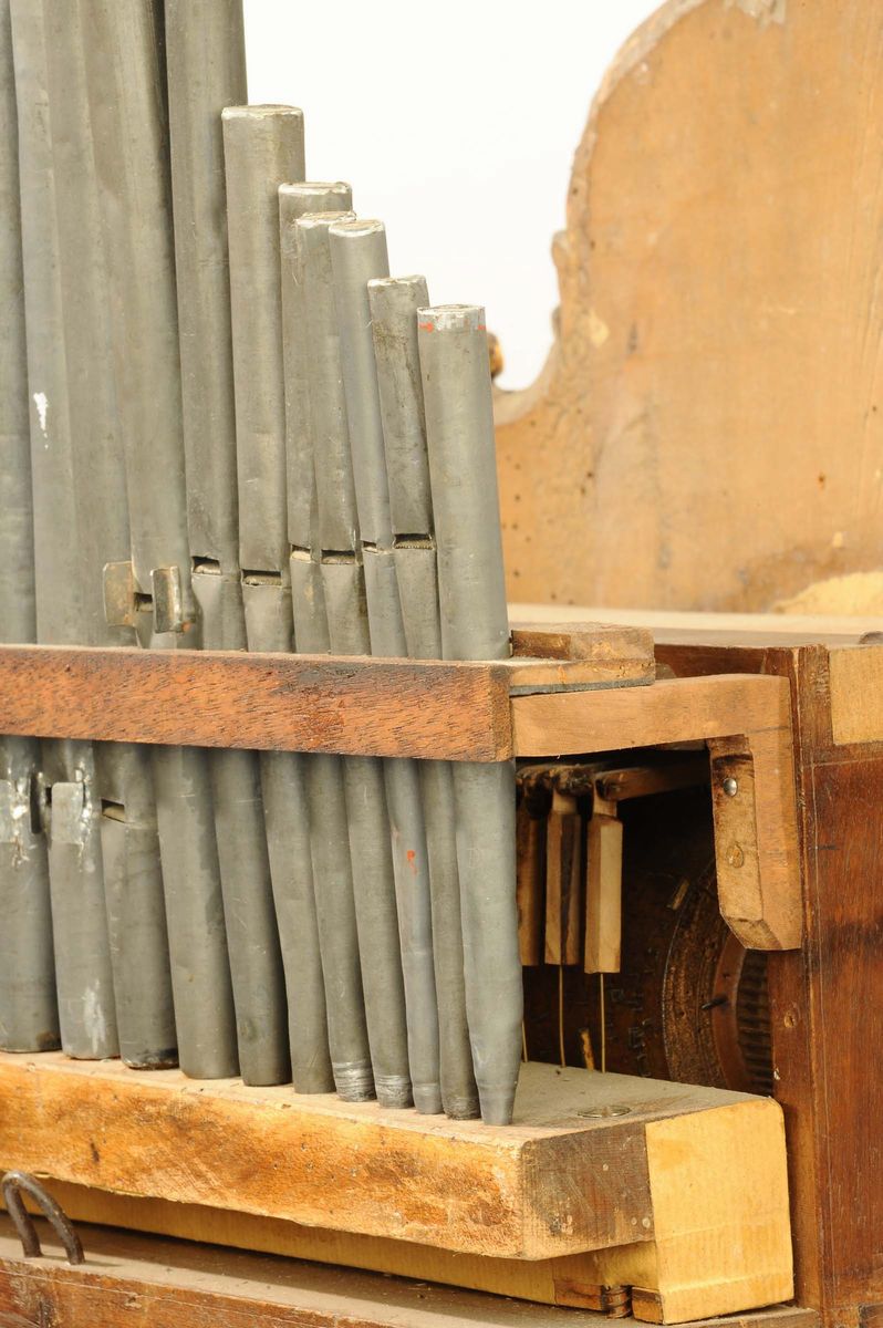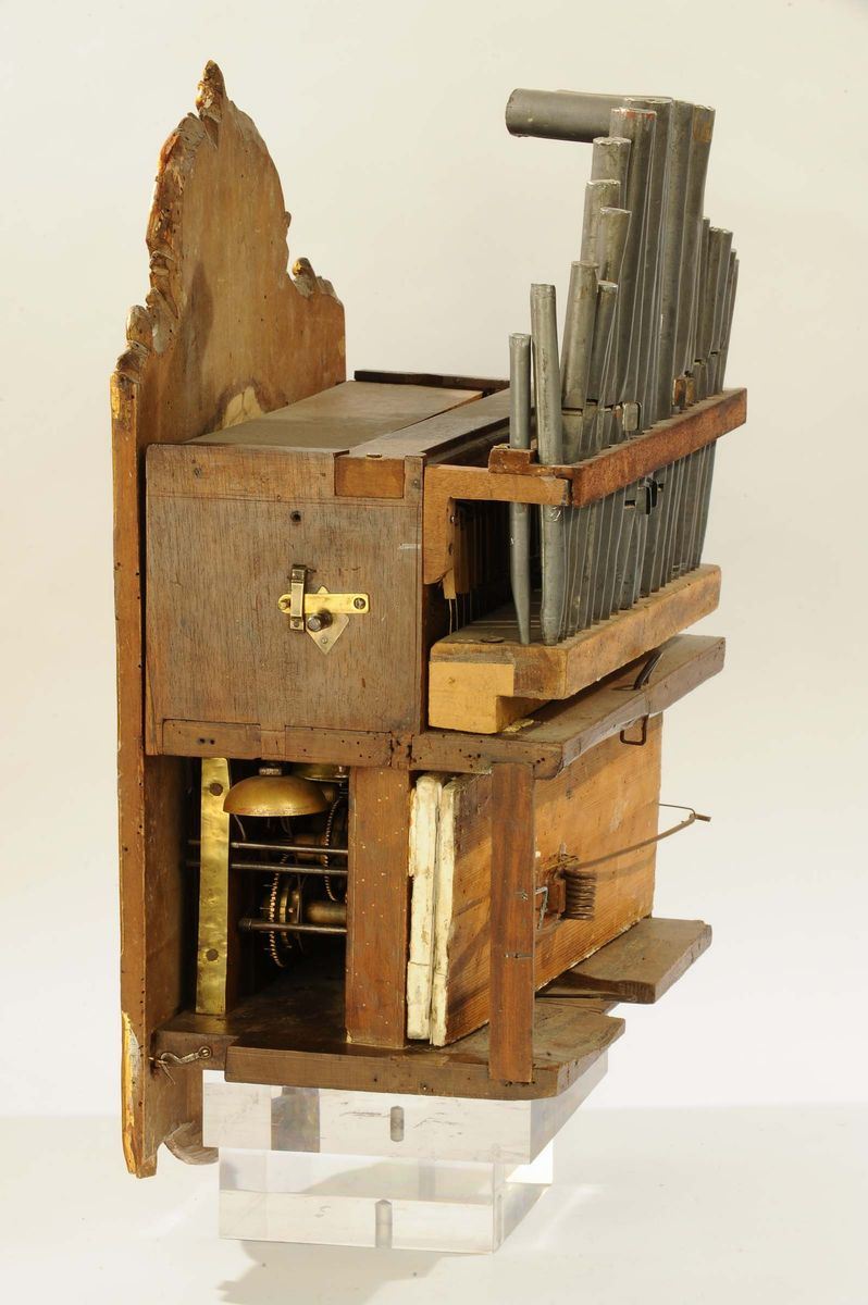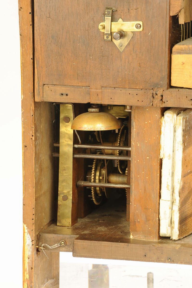 quadrante in legno dipinto e dorato, meccanica in legno e bronzo, scappamento ad ancora, suoneria ore e mezze sul campanello, organo con 8 melodie diverse con 21 canne in peltro, cm 63x42x25, parte musicale da revisionare (mancante di pesi e pendolo)