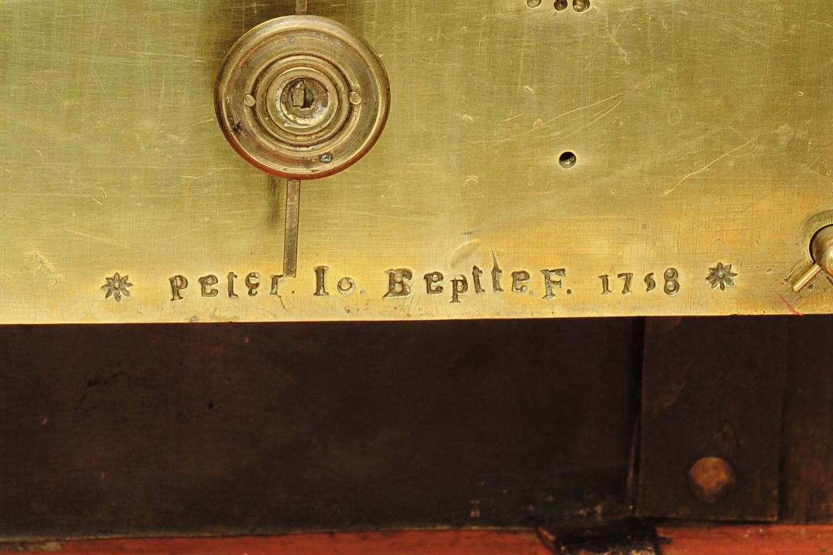 Importante orologio romano entro grande e sontuosa struttura architettonica barocca in legno ebanizzato e bronzi dorati, Peter Lo (hann) Beptte, Roma 1758quadrante dorato e cesellato e fascia oraria argentata con numeri romani e arabi, quadrantino ausiliario della sveglia, meccanica romana con scappamento a verga, suoneria a ore e quarti al passaggio, cm 65x32x82Splendido e monumentale orologio di stile barocco in legno di frutto ebanizzato e parzialmente dorato, con ricca profusione di bronzi dorati e cesellati che adornano la cassa. Sulla sommità dell’orologio è presente un putto che stringe nelle sue mani una falce e un serpente che si morde la coda (oroburo) che rappresenta il simbolo dell’eterno ritorno e del continuo rigenerarsi della vita in contrapposizione alla falce tenuta nell’altra mano che è uno degli attributi di Saturno, divinità Agricola che presiedeva alla raccolta delle messi. Essa simboleggia l’’inesorabilità del tempo che passa. Sulla cassa sono presenti decorazioni di bronzo dorato a fuoco, finemente traforate e cesellate, lateralmente e sulla parte superiore troviamo due pannelli e due ovali traforati, cesellati e dorati dove è stato applicato del velluto di colore rosso.Sulla sommità del quadrante è presente un mascherone centrale che riporta la scritta in latino “Volat Irrevocabile Tempus et Dies tuos Dinumerat” che riferisce anch’essa al tempo che passa inesorabilmente. Il quadrante centrale è riccamente adornato da fregi di bronzo dorato e quadrante argentato con numeri romani con frecce in acciaio traforate e cesellate. La meccanica è firmata Peter Io(hann) Beptte F(ecit), 1758A splendid monumental clock with quarter hour strike, quarter hour pull repeater mechanism and alarm, baroque style Case: ebonized fruit tree wood with partial gold-coloured setting, fire gilt bronze fittings, pavilion- shaped case with convex and concave curves.Four gilt volute feet moulded and curved base, four pillars with gilt volute capitals and baroque strap work fittings set across the corners. The concave sides with sound holes, decorated with gilt acanthus and volute grid, red fabric lining. Gold-rimmed cornice. Pediment with convex and concave curves, semicircular aperture for the dial, central mascaron and baroque strap work. Lateral horizontally oval sound holes, decorated with gilt acanthus and volutes, red fabric lining. Convex pediment with decorative urns, crowning putto; the putto holds a scythe in his left hand and an Ouroboros (a serpent eating its own tail) in his right hand. Dial: brass, fire gilt, applied floral ornaments and winged angel heads, semicircular dial top with engraved mascaron, festoons and flower garlands. Underneath plaque with foliate decoration and Latin inscription: “Volat Irrevocabile Tempus et Dies tuos Dinumerat” (“Time flies irrevocably and counts your days”). Applied silvered dial with inlaid radial Roman numerals, gilt frosted centre with central silvered alarm disc with Arabic numerals and opening for blued mock pendulum, pierced and silvered hands. Movement: rectangular-shaped brass movement, signed, 3 barrels,3 hammers / 2 bells, baluster-shaped movement pillars, verge escapement, short pendulum, signed: Peter Io(hann) Beptte F(ecit) 1758OuroborosThe Ouroboros oder Uroboros (“eats its tail”) is a serpent eating its own tail and thus forming a closed circle. This iconographic image goes back as far as ancient Egypt. The Ouroboros symbolises cosmic unity, a closed cycle of renewal and repetition that has neither beginning nor end.In this case the Ouroboros is in contrast to the scythe, which stands for relentless impermanence and death. The inevitable transience of time is also the subject on the Latin banner on the Dial: “Volat Irrevocabile Tempus et Dies tuos Dinumerat” (“Time flies irrevocably and counts your days “).