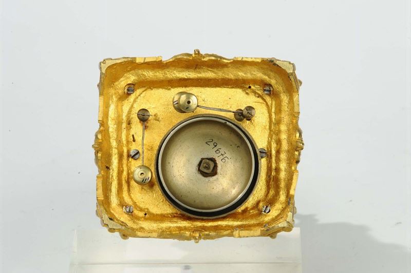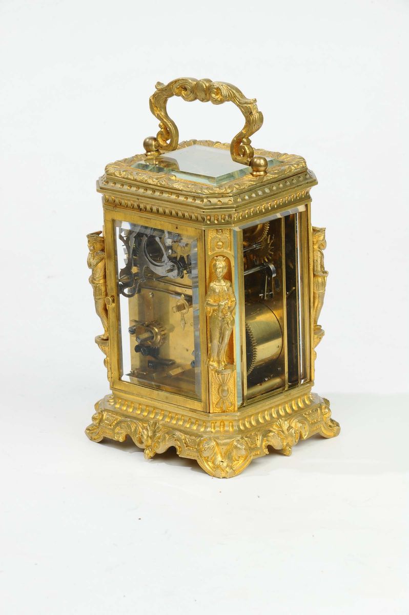suoneria ore e quarti a passaggio e richiamo, con sveglia e data, quadrante in porcellana, blocchetto dello scappamento con bilancere speciale con contrappesi a mezzaluna, cm 11x10x21