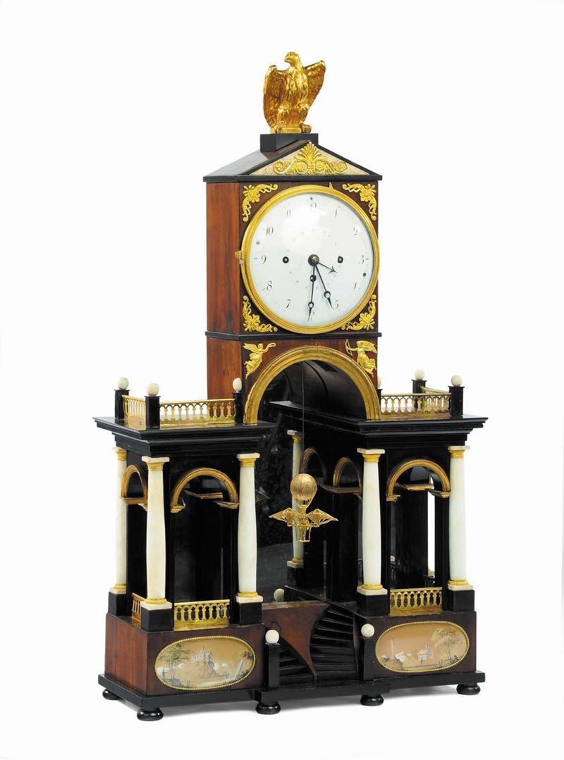 Orologio architettonico Biedermeier da tavolo in legno con parti ebanizzate e bronzi dorati, XIX secolo