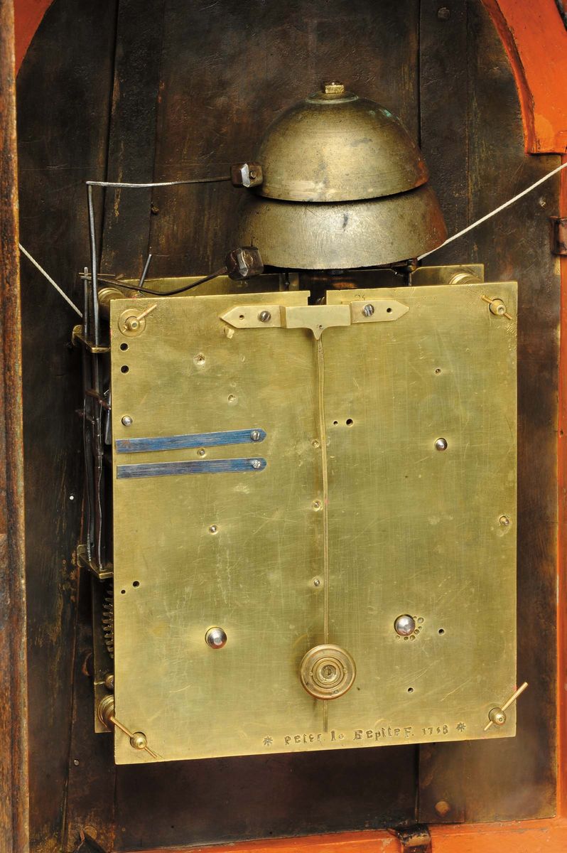 quadrante in smalto con datario e numeri romani e arabi, lancette in stile Breguet, meccanica viennese con scappamento ad ancora e sospensione a filo di seta, suoneria a ore e quarti al passaggio, carica giornaliera, cm 40x14x70