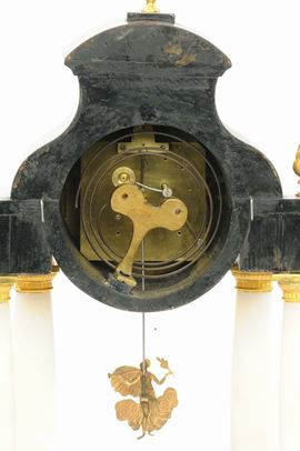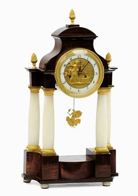 Orologio Biedermeier in mogano con colonne in alabastro, Austria XIX secolo