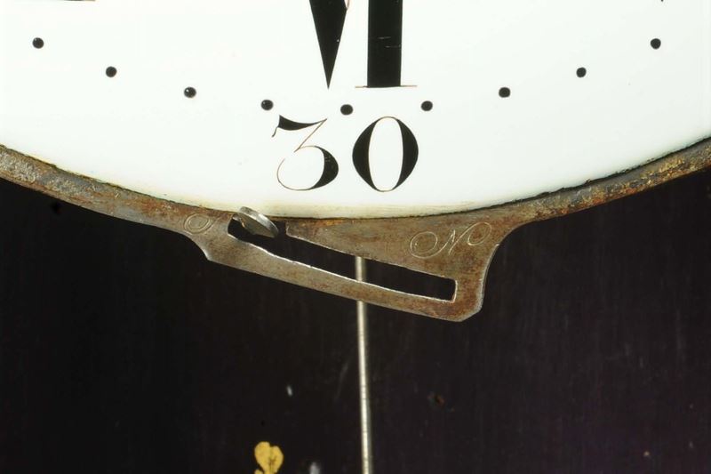 decori floreali in oro, ricchi fregi in lamierino e bronzo fuso e sbalzato, quadrante in smalto con numeri romani, lancette a fantasia, movimento a scappamento a verga, suoneria ore/quarti al passaggio con leva per selezione suona/non suona, sveglia a tiraggio con lancetta centrale, altezza cm 113