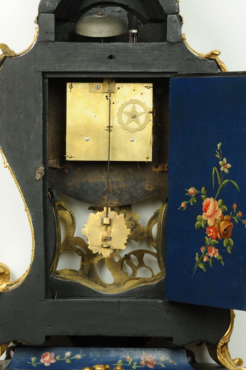 Orologio Cartel da parete laccato e dipinto a fondo blu, XVIII secolo