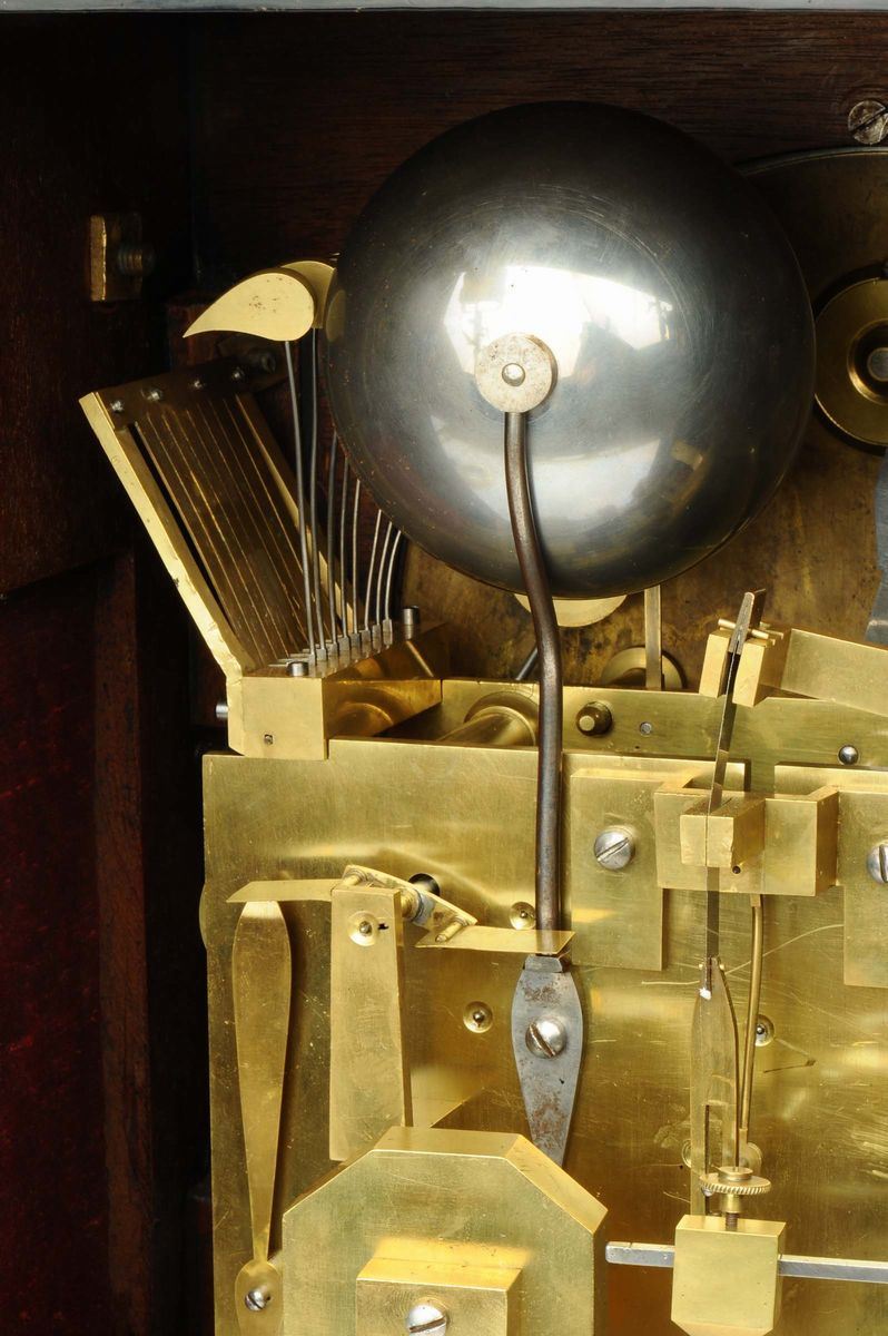 cassa di forma rettangolare, base modanata sorretta da quattro zampe in bronzo dorato, applicazioni di fregi, greche e cariatidi in bronzo dorato. Cappello con terminale in bronzo finemente elaborato con motivi floreali e ornato ai lati da quattro pinnacoli.Quadrante in metallo argentato e decorato con incisioni floreali. Numerazione romana per le ore e due lancette a fantasia per l’indicazione del tempo. Tre quadrantini ausiliari posti in alto permettono il cambio della musica, l’esclusione della suoneria e della regolazione del pendolo. Meccanica inglese con scappamento ad ancora e sospensione a lamella, suoneria a ore e quarti al passaggio su gong e doppia musica su carillon a otto campanelli, cm 40x28x65