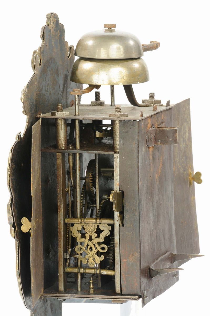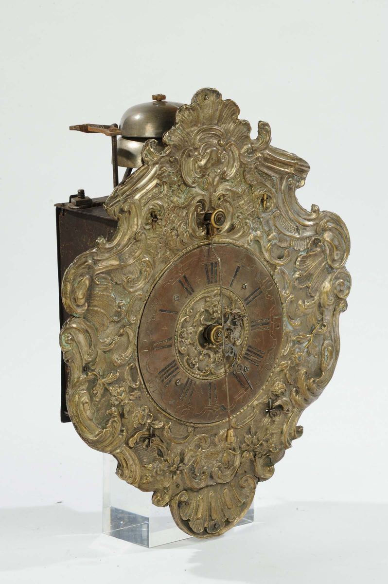 quadrante in rame sbalzato e argentato, scappamento a verga, suoneria ore e quarti, gran suoneria, tre treni di ruote, cm 39x31x11