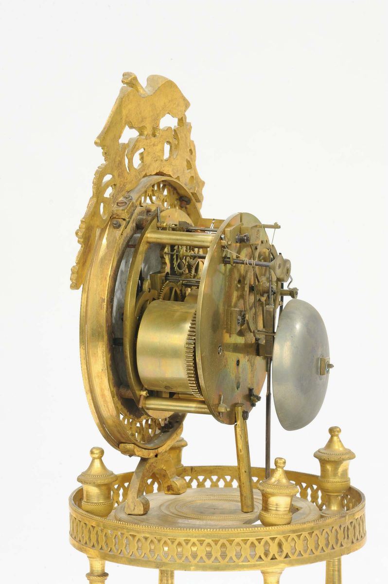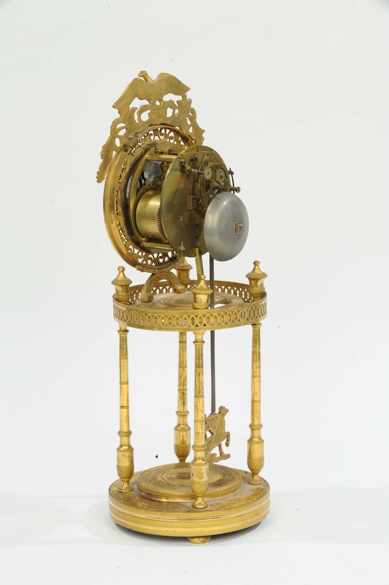 base circolare su cui quattro colonne elaborate sorreggono un altro elemento circondato da una balaustrata a fantasia e quattro pinnacoli. Il movimento dell’orologio è collocato sulla sommità della cassa e decorato con un fregio dove un’aquila spiega le ali. Quadrante in smalto bianco con le ore dipinte a numeri romani e lancette in ottone a fantasia. Meccanica a scappamento ad ancora con sospensione a filo e registro a tergo; suoneria a ore e mezze al passaggio su campanello, carica settimanale, cm 15x15x39