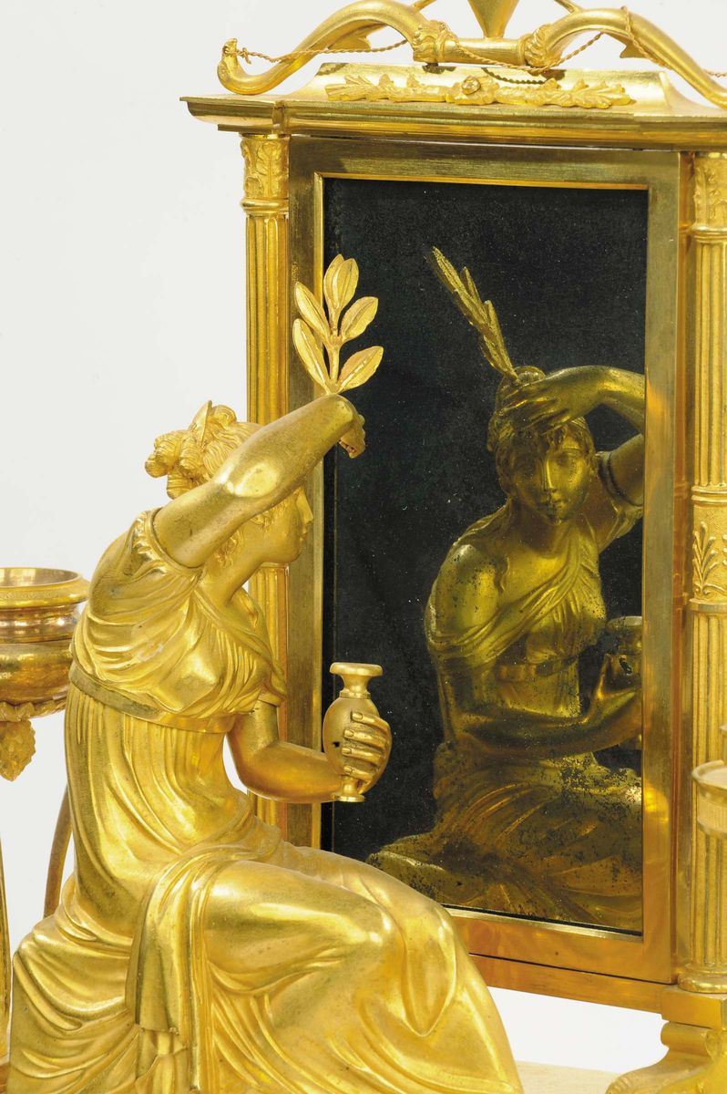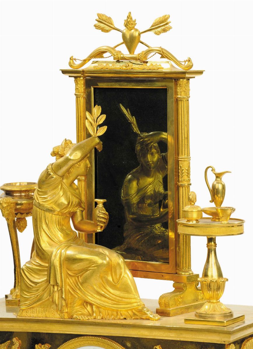 movimento con scappamento ad ancora, suoneria delle ore e mezze al passaggio, cm 34x15x53Quest’orologio di raffinata fattura e qualità nei dettagli è databile attorno al 1810, è contraddistinto da un ampio piano sopra la macchina dell’orologio, sul quale si svolge una realistica scena di toilette mattutina, secondo la moda del primo ottocento francese: una bella fanciulla si sta adornando avanti ad una grande specchiera circondata dai canonici oggetti delle abluzioni mattutine, tutto in rigoroso stile archeologico neoclassico. Ai lati si vedono un’athénienne ornata da bucrani e un tavolino rotondo a ringhiera con alcune suppellettili per abluzioni. Forse la composizione è ispirata alla cosiddetta 'Toeletta di Psiche’, una particolare iconografia, legata al mito di Amore e Psiche, che fu sviluppata tardivamente e in modo autonomo rispetto al romanzo di Apuleio, dove le cure di bellezza cui è sottoposta Psiche prima dell’incontro con il suo innamorato sono accennate brevemente. L’iconografia di partenza sembra essere un affresco pompeiano nella casa di Marco Lucrezio Fronto, che raffigura la Toeletta di Venere. Questo soggetto che interessò Raffaello all’epoca delle pitture nella Loggia di Amore e Psiche alla Farnesina e di cui rimane testimonianza, nell’adattamento alla figura di Psiche, in una stampa di Giulio Bonasone (ca 1560, Londra, British Museum), ebbe in seguito una certa fortuna e divenne un soggetto tipico. La utilizzò ad esempio anche Boucher per il soggetto di un arazzo realizzato nel decennio 1740, durante il suo soggiorno romano (oggi al Palazzo del Quirinale). Sul nostro orologio la figura di giovanetta, abbigliata e pettinata come una dama del periodo Direttorio e seduta di fronte ad una grande specchiera, non ha alcun legame iconografico con la toeletta di Venere o di Psiche, episodi composti da più personaggi; tuttavia la presenza di una cimasa sopra lo specchio, composta da un cuore trafitto da due frecce che formano una curiosa panoplia con un arco posto in orizzontale, ci ricorda un tipico emblema di Cupido. Né va dimenticato che questa tipica specchiera neoclassica francese si chiama 'psiche’.La grande base dell’orologio è adorna da applicazioni di bronzo dorato raffiguranti degli amorini volanti, come a ribadire il carattere sottilmente erotico della scena di adornamento. L’orologio è sostenuto, sopra una base di vert-Maurin da quattro piedi a forma di grifi, favolosi animali con testa di aquila e corpo di leone alato, sacri ad Apollo e custodi dei suoi tesori