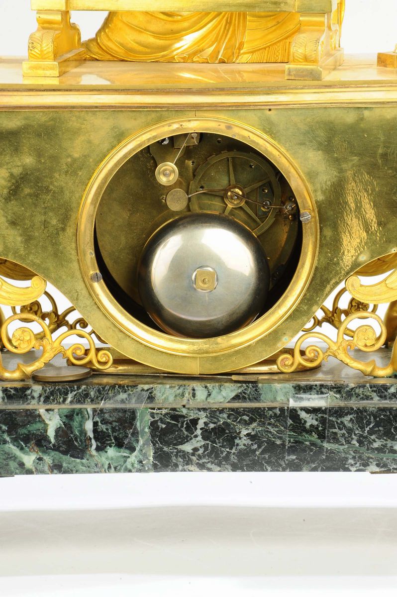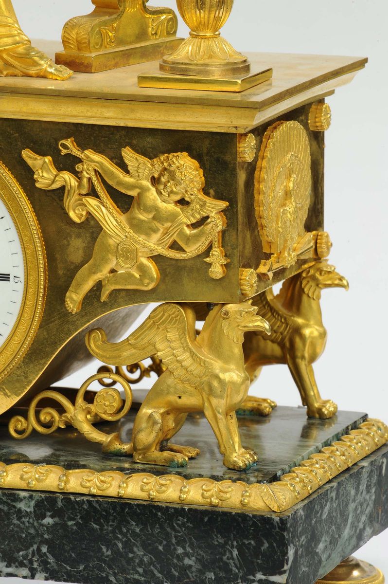 Orologio Direttorio in bronzo dorato con toeletta di Psiche con base in verde antico, Francia inizio XIX secolo