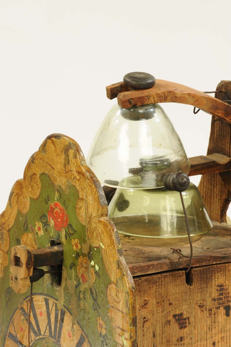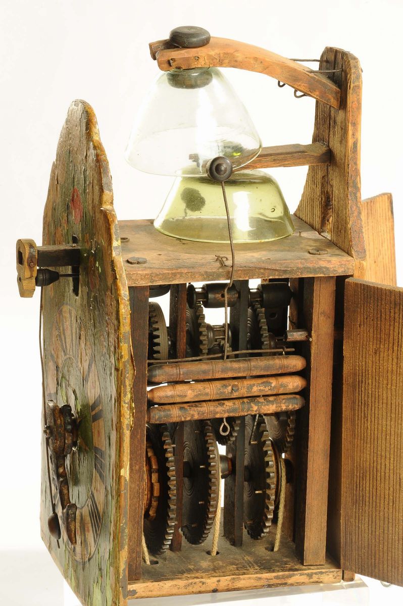 orologio completamente in legno con due campane in vetro, tre treni di ruote, scappamento a verga, suoneria ore e quarti a passaggio, cm 34x21x19