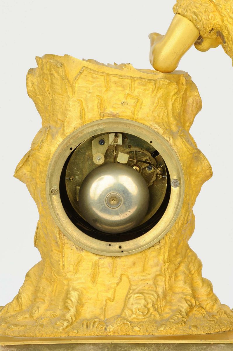movimento con scappamento ad ancora, suoneria delle ore e mezze, cm 38x16x49Quest’orologio presenta come personaggio mitologico un’immagine di Ercole ispirato alla celebre scultura dell'Ercole Farnese. L’orologio, noto in più versioni con piccole varianti, è databile attorno al 1815 e il quadrante è firmato da 'Filon à Paris’. Ottomeyer e Pröschel (1, n.5.18.19) pubblicano un modello identico la cui figura è attribuita a Feuchère e Fossey, Parigi 1825 circa. L’Ercole Farnese era assai noto in Francia da calchi realizzati per i re e per le accademie sia di Roma che di Parigi. Soprattutto una copia a grandezza naturale era stata posta dall’architetto Le Nôtre nel giardino di Vaux-le-Vicomte (il castello che si era fatto costruire nel 1654 Nicolas Foucquet il potente ministro di Luigi XIV) quale scultura – simbolo dell’intero complesso che prevedeva anche all’ interno del castello quadri con scene della Vita di Ercole dipinti da Charles Lebrun. Tuttavia la scultura di bronzo dorato di quest’orologio riecheggia l’Ercole Farnese soltanto per l’aspetto pensoso dell’eroe e un’identica postura delle gambe; Ercole si appoggia alla clava con la mano destra, mentre con la sinistra, appoggiata su un grande tronco d’albero, regge le tre mele d’oro. Nella scultura farnesiana invece la destra è volta dietro la schiena e la sinistra pende lungo la clava e la pelle leonina contro cui l’eroe si puntella. Inoltre l’Ercole Farnese è completamente nudo, mentre la scultura dell’orologio, sicuramente per una questione di moralismo borghese, è avvolta nella pelle del leone. Questo tipo d’iconografia, contraddistinta dalla clava usata come bastone, è precipua di altre immagini erculee non particolarmente famose nel periodo della Restaurazione, cui risale l’ideazione dell’orologio.L’orologio è adorno sulla base di numerosi attributi 'erculei’ come la pelle del leone nemeo fra arco e frecce e i serpenti intrecciati alludenti alla primissima impresa dell’ eroe che ancora in culla strozzò due serpenti inviatigli dall’ eterna nemica Giunone.