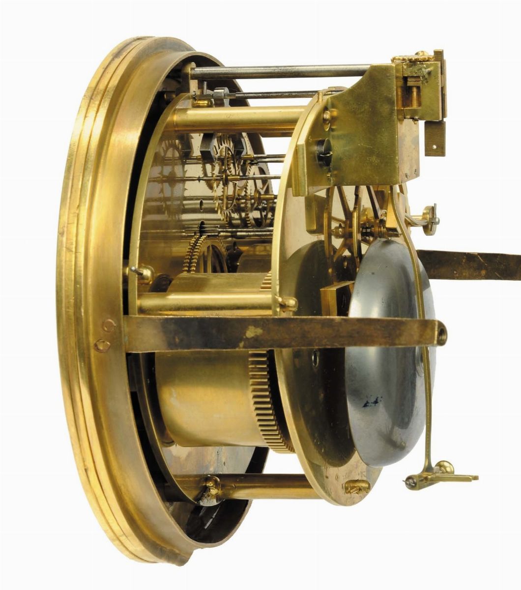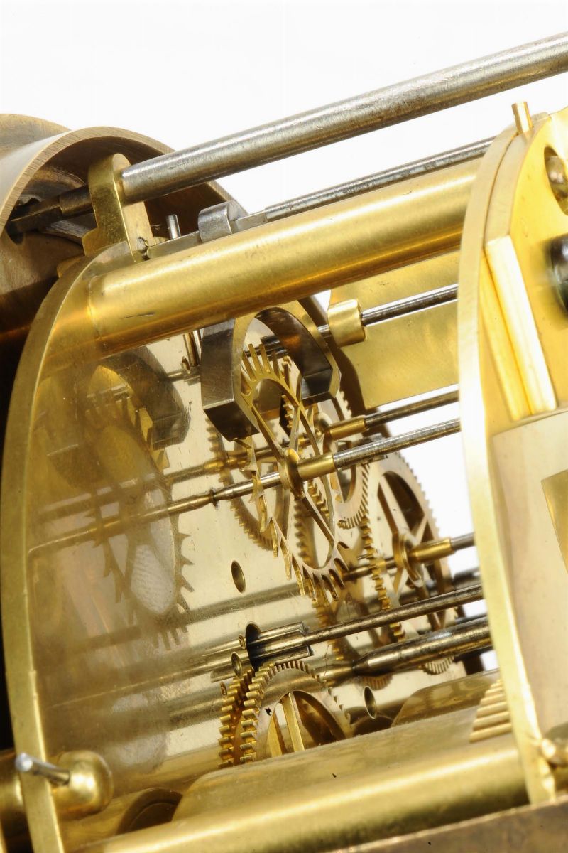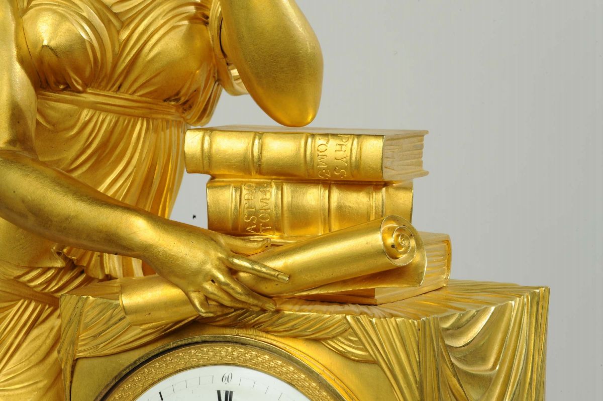 cm 42x18x70la Musa, figura predominante, tiene nella mano destra il diploma ed è appoggiata ad alcuni libri di scienza, quale fisica volume III e astronomia volume I. Fin dall’antichità le Muse sono, infatti, il simbolo dell’ispirazione e di tutte le attività intellettuali. Alla base di marmo verde antico è rappresentata una scena dove alcuni cherubini sono intenti a studiare architettura, astronomia e disegno. Sotto il quadrante dell’orologio, si trova un gallo tra due torce a ricordare che il gallo annuncia il sorgere del sole e che lo studio richiede tempo e impegno fin dalle prime ore del mattino. All’interno della struttura di bronzo (non visibile dall’esterno), dove alloggia la meccanica dell’orologio, è presente una scritta incisa in stampatello che riporta: “HVIVS AMOR PIOHORADILEN EDVCAVIT VTIAM PAREMHO MERIUSQ IRCO-CVMVIRAM”.Un orologio simile è annoverato presso il Museo de Relojes di Jerez de la Frontera in Spagna. Un esemplare analogo è pubblicato sul Tardy – Les Plus Belles Pendules Française, pagina 252, anno di pubblicazione 1994. Il movimento è un “regolatore di precisione” realizzato dal famoso orologiaio Pierre-Basile Lepaute