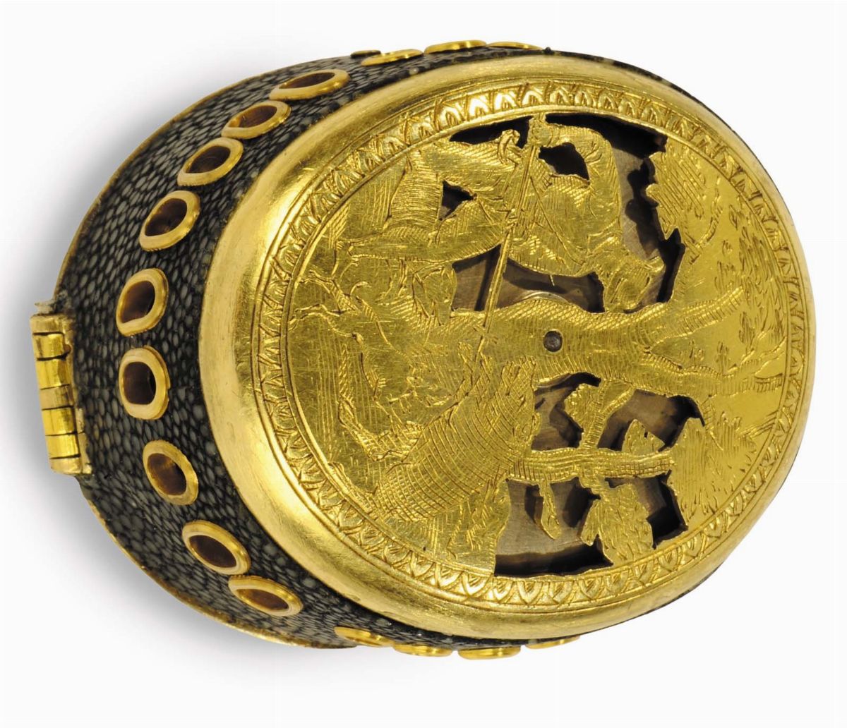 cassa in bronzo dorato rivestito con pelle di rettile e inciso finemente con scena di caccia e stemma nobiliare sul coperchio, scappamento a verga, sveglia (martello mancante)