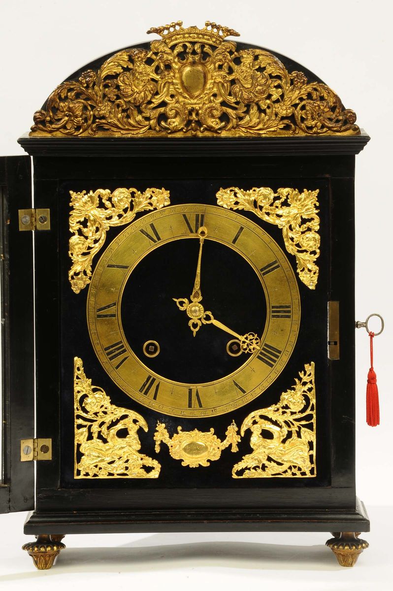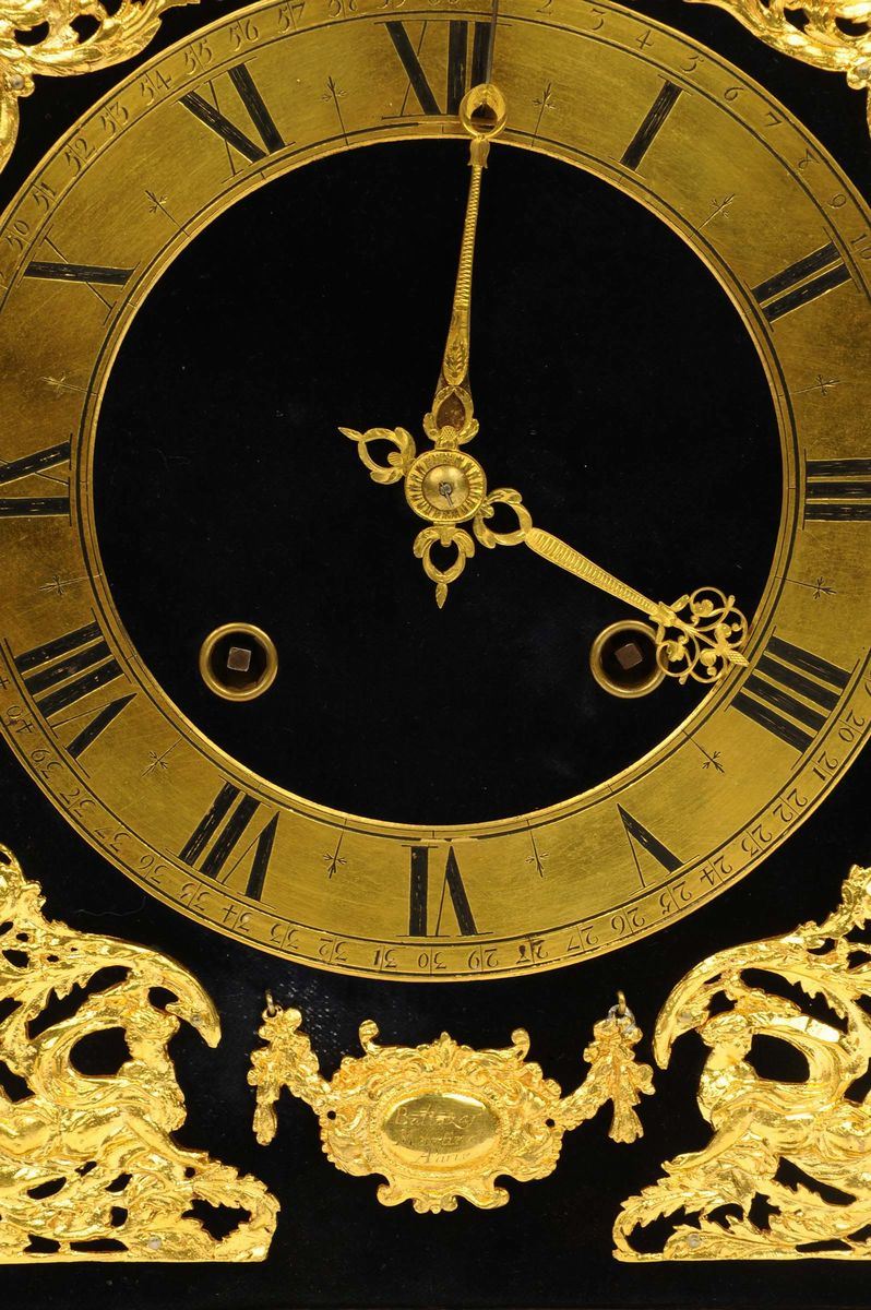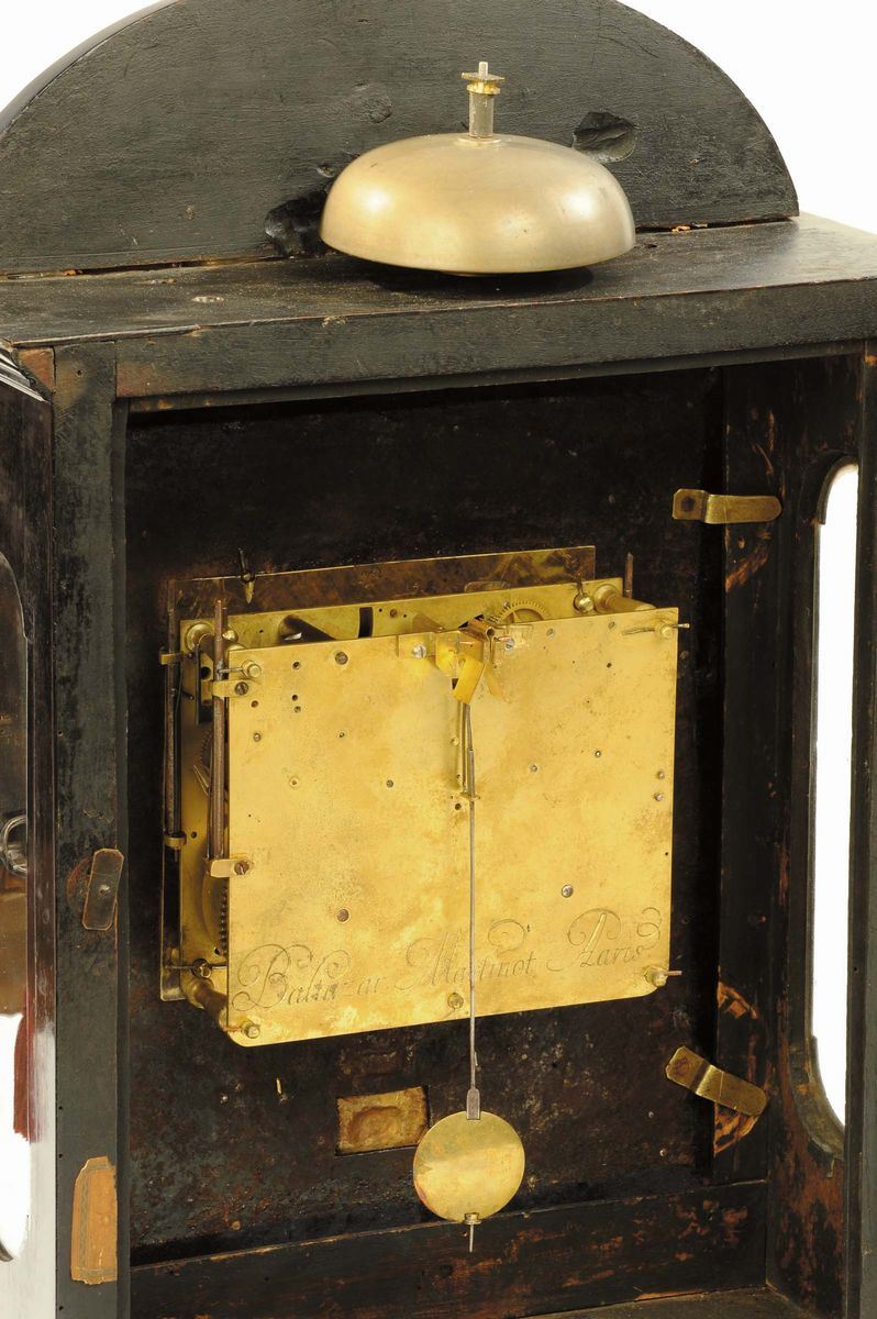 cassa lastronata in ebano con ricche applicazioni di bronzi dorati, scappamento a verga, suoneria ore a passaggio, richiamo ore e quarti, firma sul quadrante, cm 49x31x13 (martelli e campana mancanti)