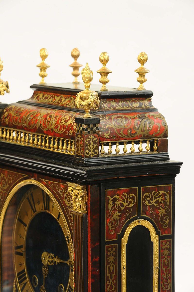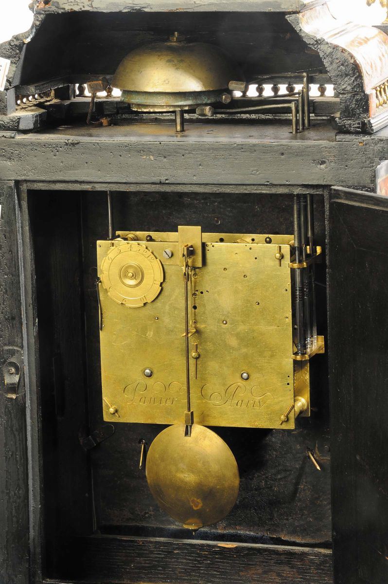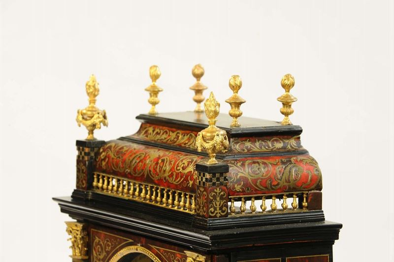 cassa in legno lastronato in tartaruga ed ebano, bronzi dorati, scappamento a verga modificato ad ancora, suoneria ore/mezze a passaggio, ore e quarti su 3 campanelli a richiesta, firmato sul quadrante e sulla meccanica, cm 52x32x15