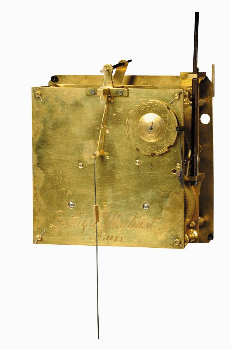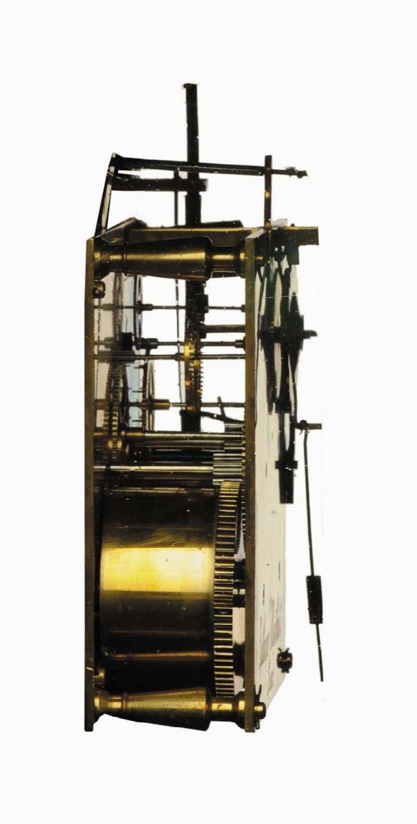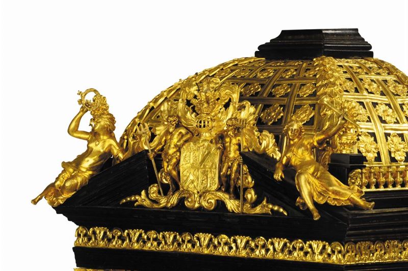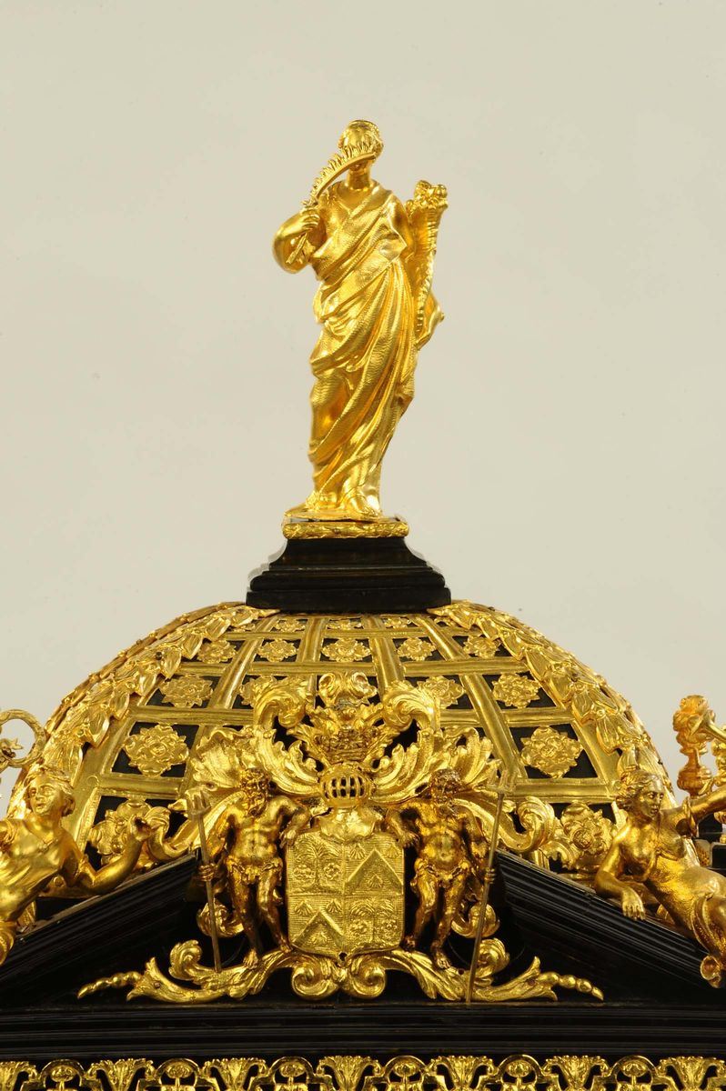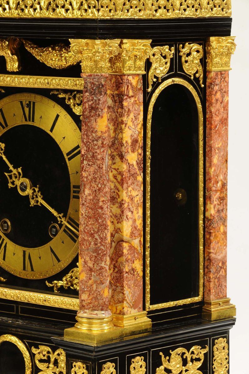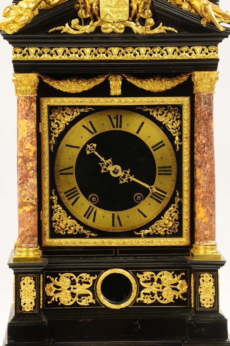 ricca cassa in rovere lastronato con ebano e argento a struttura architettonica con colonne che reggono un’architrave a timpano spezzato, bronzi incisi e dorati, colonne in diaspro di Sicilia. Sommità con cupola traforata, stemma nobiliare e figure a tuttotondo in bronzo fuso cesellato e dorato, quadrante in bronzo con numeri romani e lancette dorate, scappamento a verga, suoneria ore e mezze a passaggio, cm 83x35x22