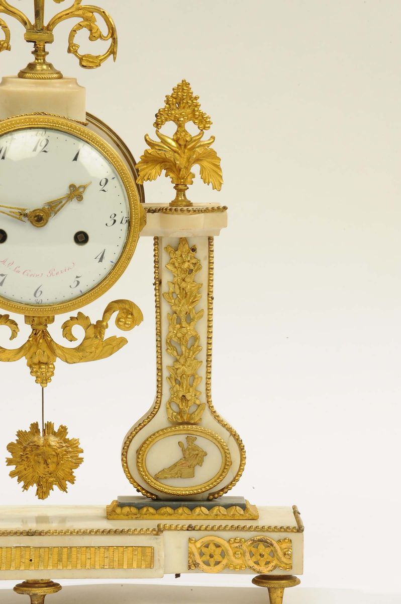 Pendola a portico Luigi XVI in marmo bianco, Francia 1790 circa