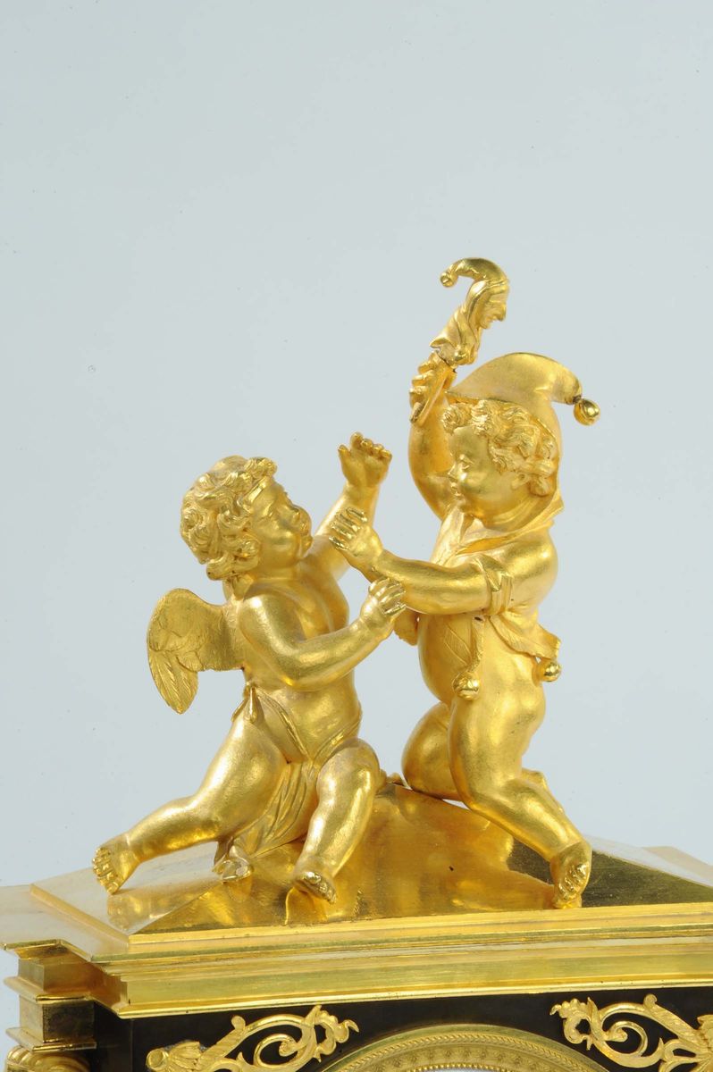 sull’apice la figura di un fanciullo, con un berretto da giullare, porta via a un putto alato una marionetta.Ai lati della cassa vi sono due cariatidi in stile egizio e vari fregi raffiguranti fenici e bracieri, mentre, al centro della base, un fregio a bassorilievo ritrae una scena in cui sei putti si trovano attorno a un fuoco.Quadrante in smalto bianco con una numerazione romana per le ore e due lancette a fantasia in ottone. Firmato “Warnier Lné à Paris”.La meccanica è a scappamento ad ancora con sospensione a filo e registro a tergo; suoneria a ore e mezze al passaggio su campanello, carica settimanale, cm 32,5x12x50