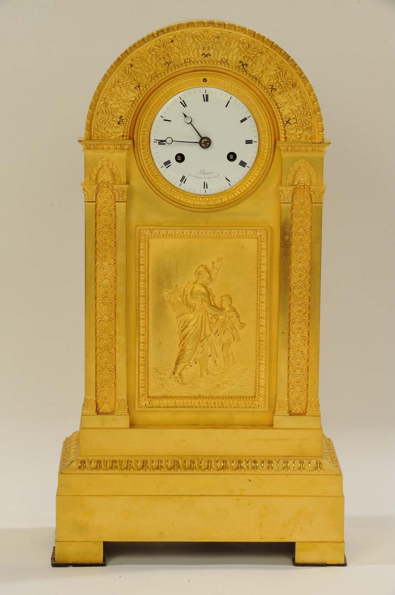 Pendola Impero Bassot con cassa ad arco in bronzo dorato al mercurio, Francia metà XIX secolo