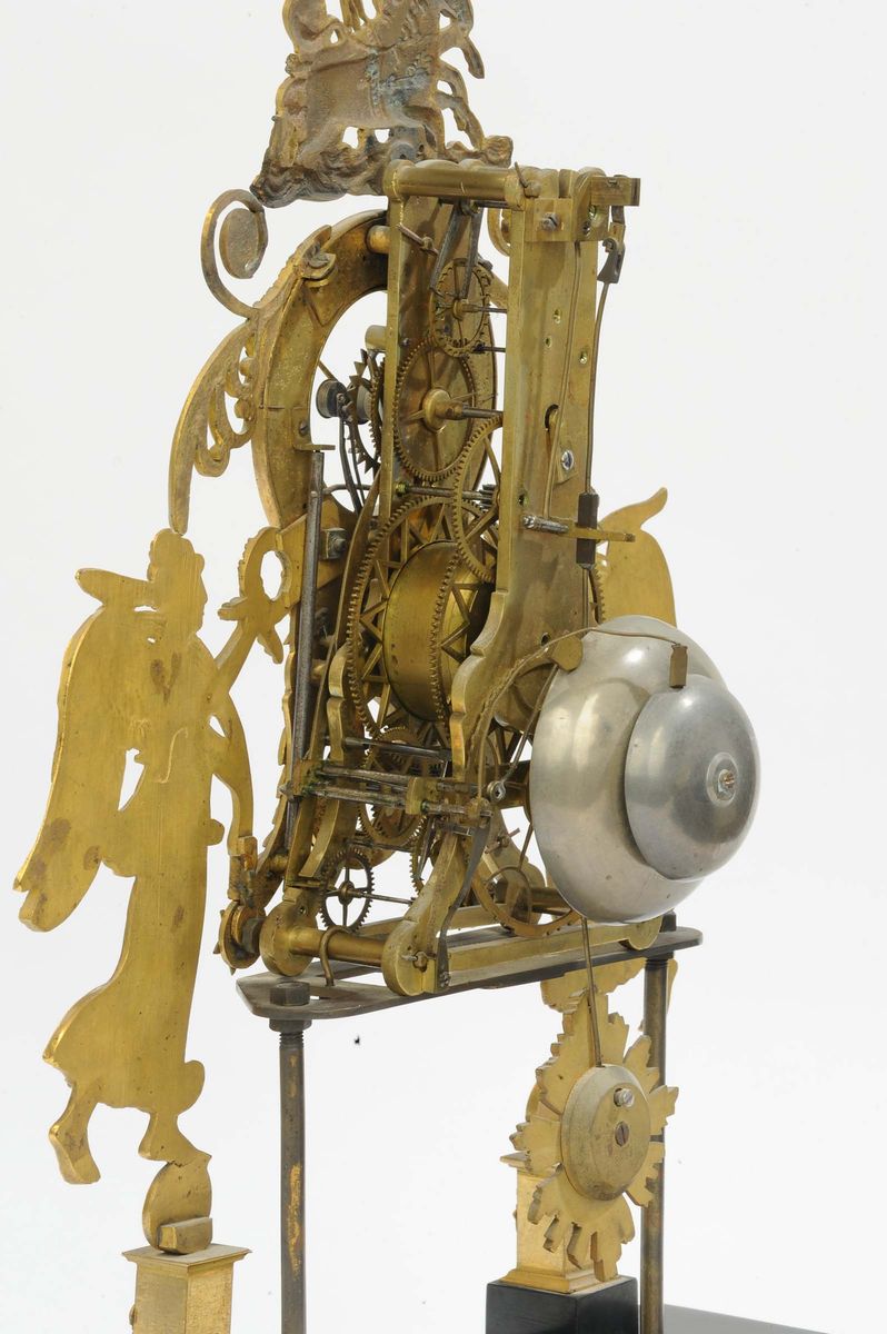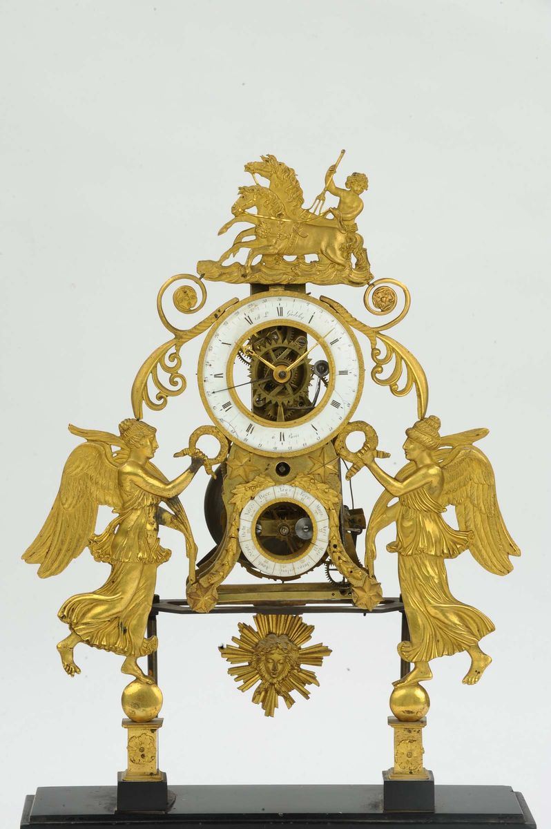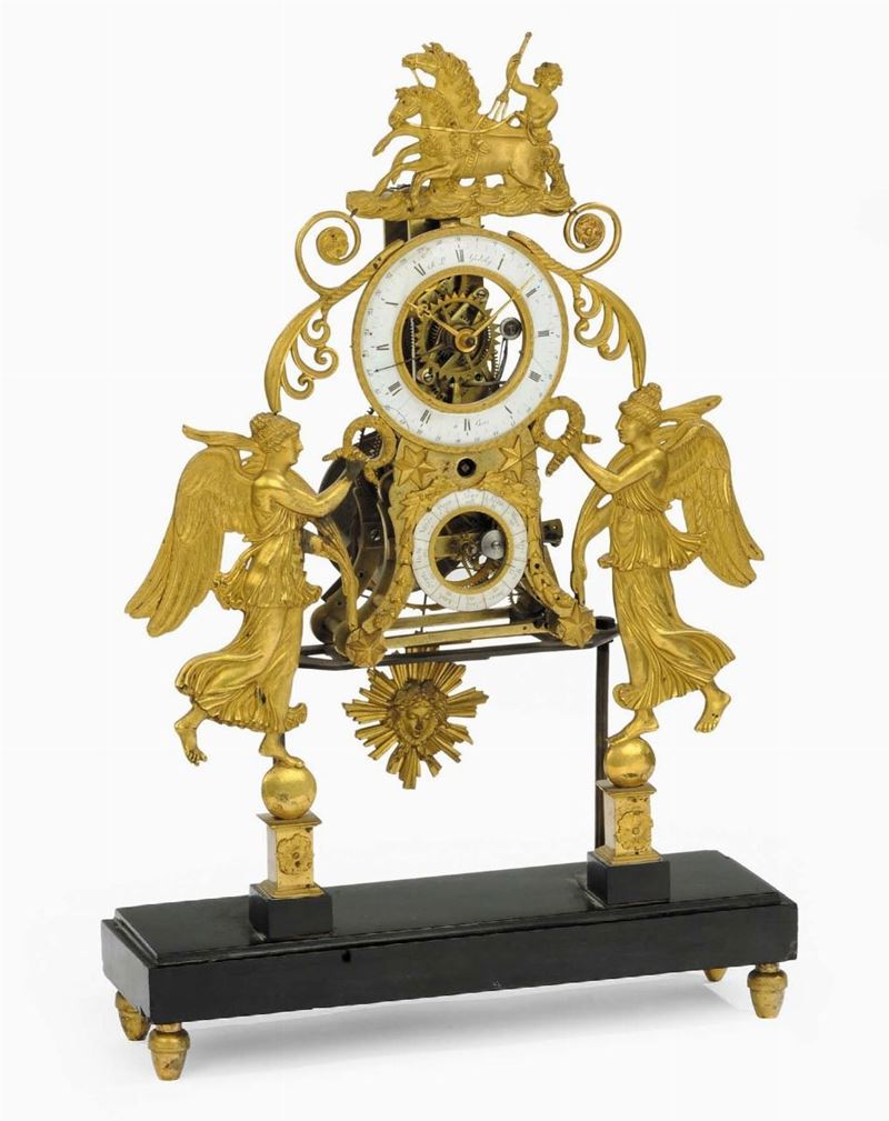Pendola Impero scheletrata in bronzo dorato raffigurante due figure femminili alate, XIX secolo