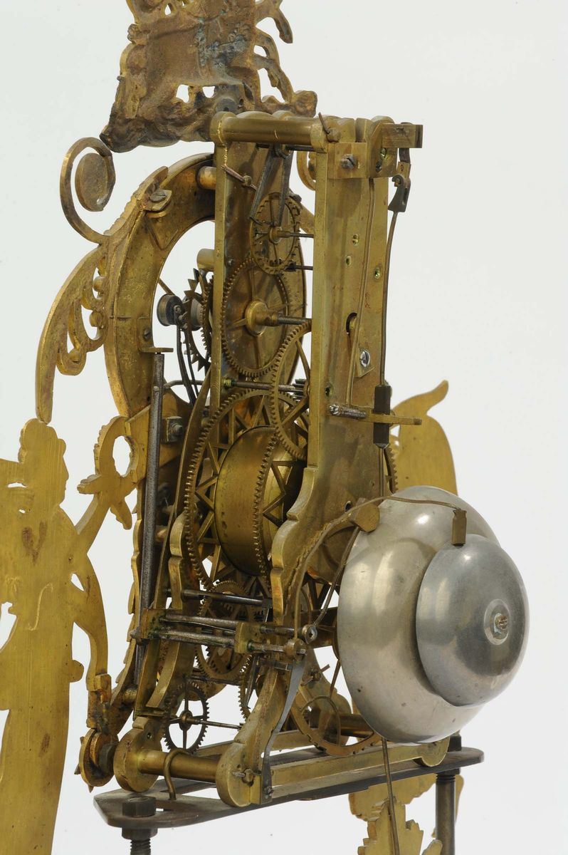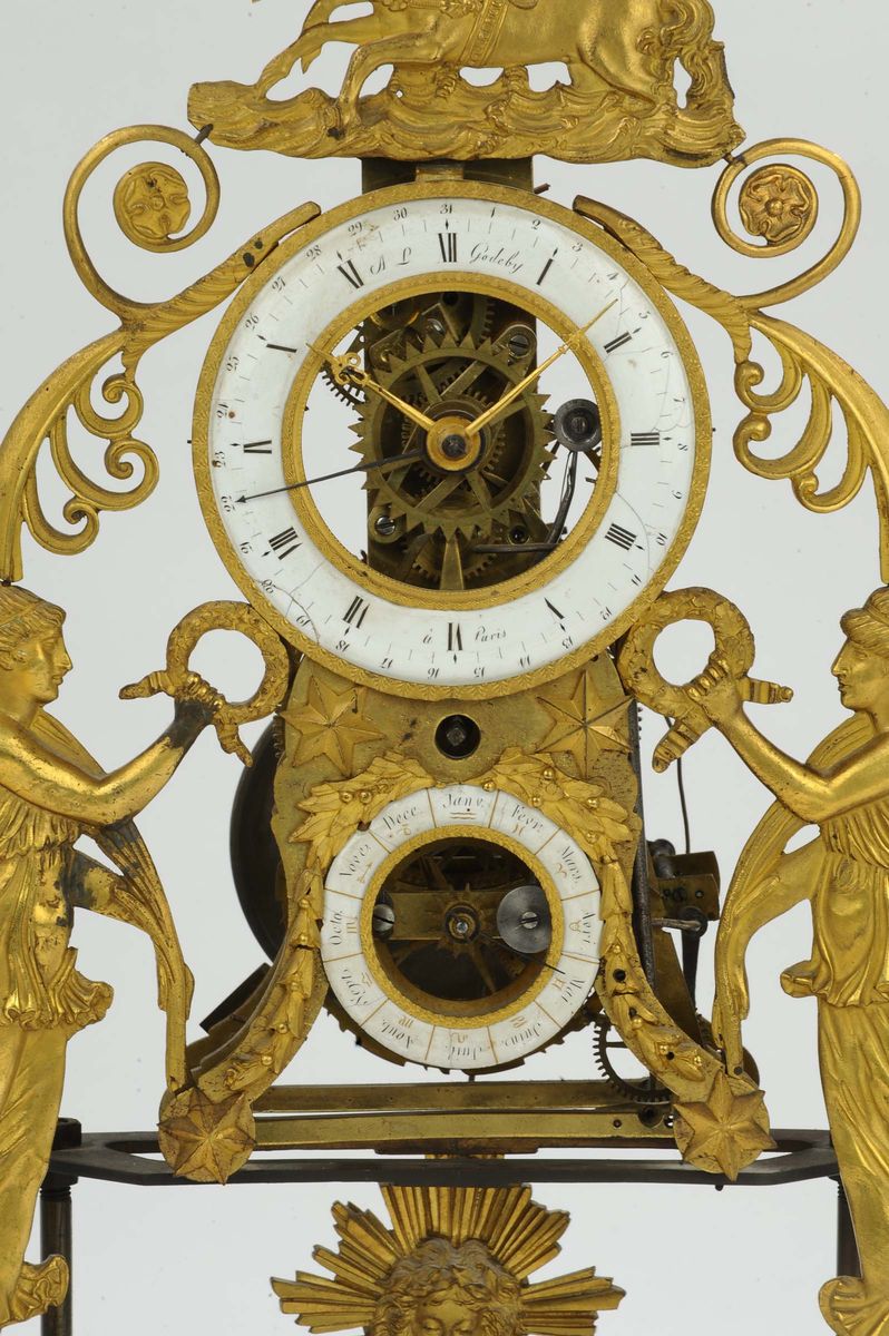 le figure sono poste ai lati dell'orologio e reggono in mano una foglia di palma e una corona d'alloro, mentre in apice un tritone tiene per le redini due cavalli.Quadrante con fascia oraria in smalto bianco con le ore dipinte a numeri romani; suddivisione della minuteria e indicazione dei giorni del mese. In basso vi è un quadrantino ausiliario dei mesi con l'aggiunta dei segni zodiacali.Meccanica a barile unico. Suoneria a ore e quarti al passaggio su due campanelli. Scappamento a cheville con sospensione a molla