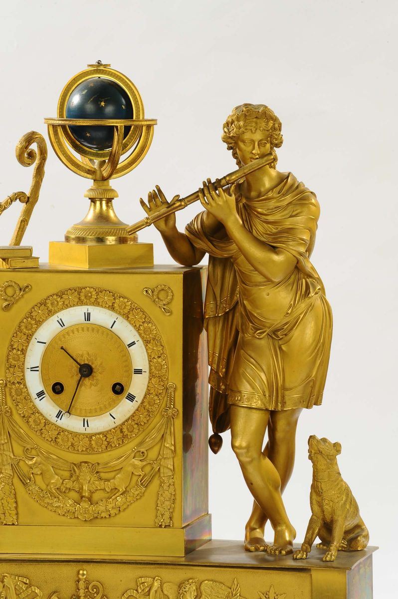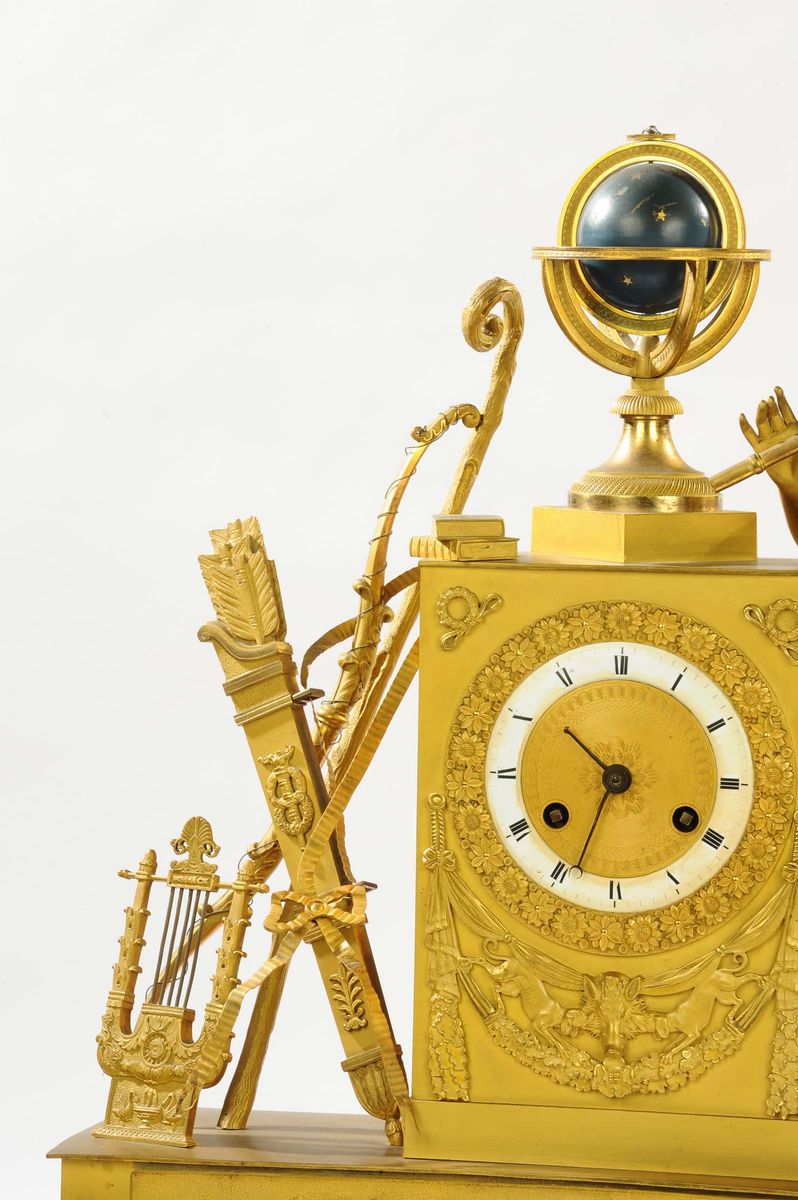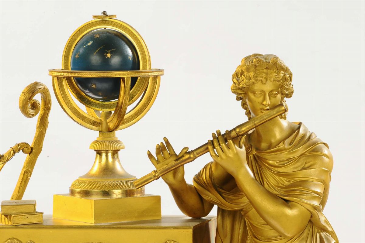 Pendola in bronzo dorato raffigurante Apollo e allegoria della musica, Francia 1820 circa