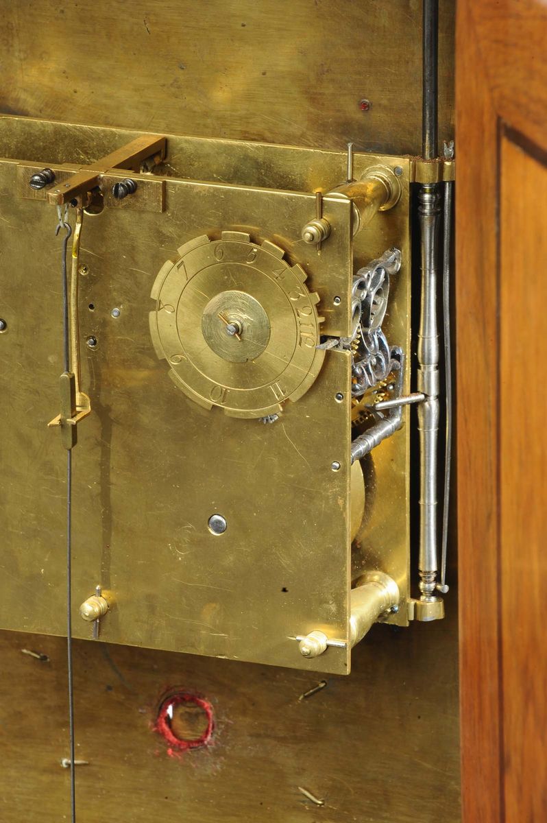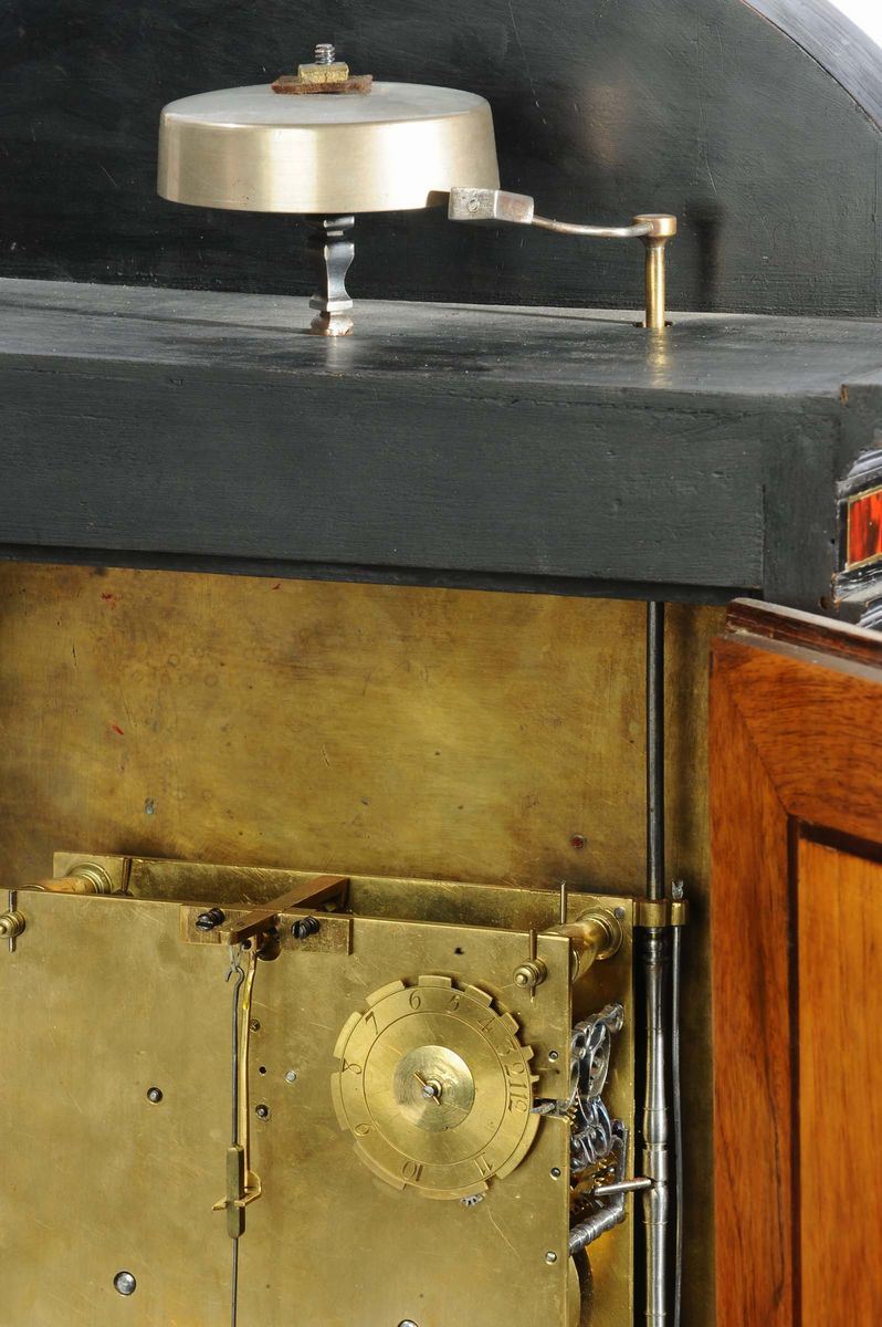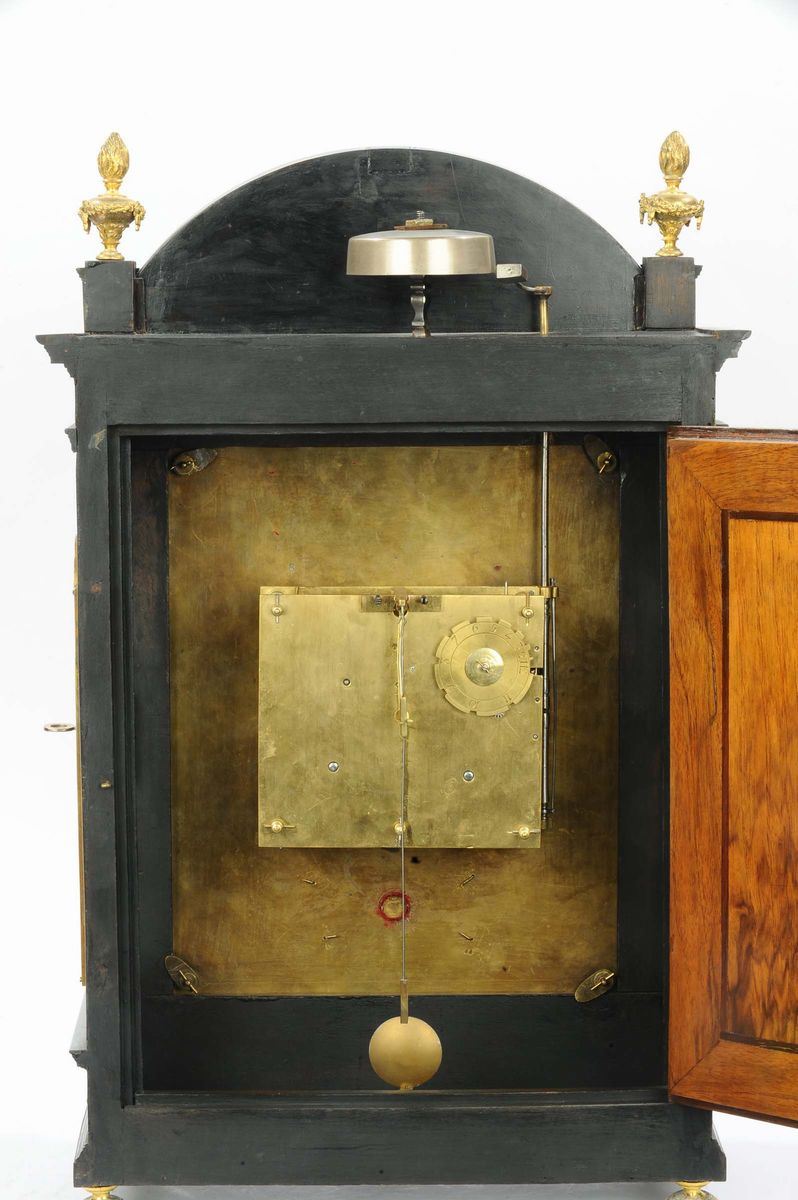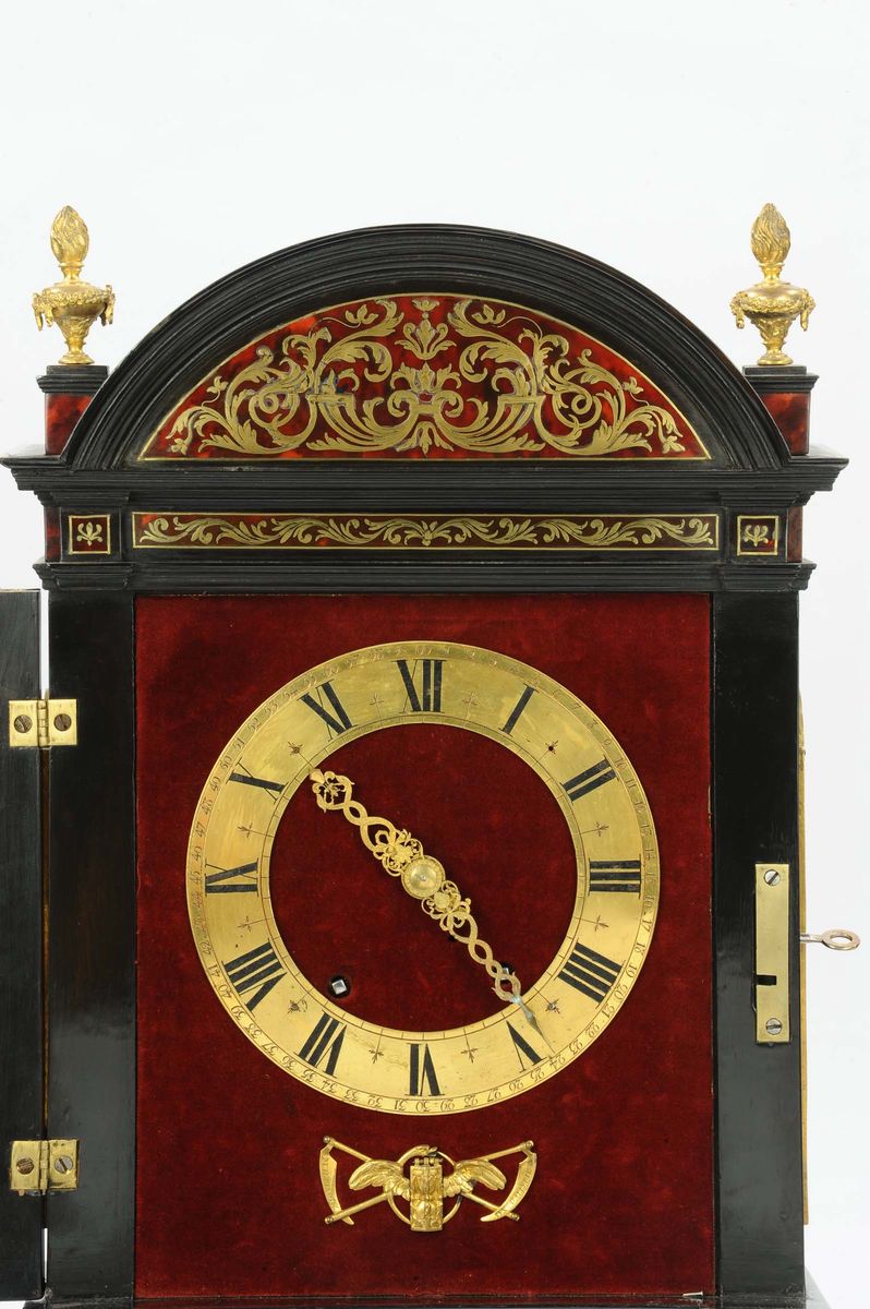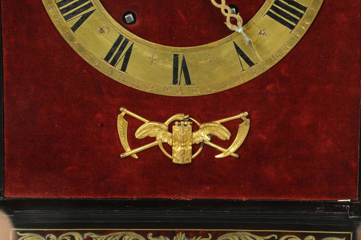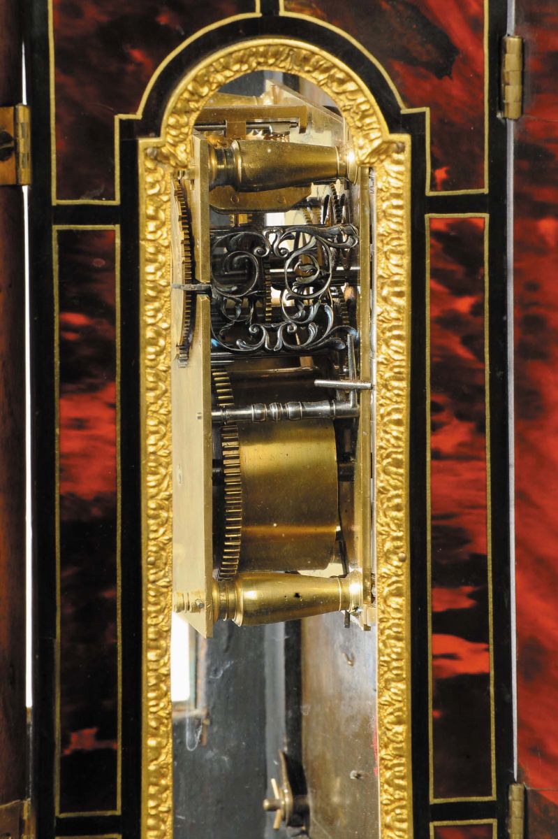 due lesene abbellite con capitelli in stile corinzio affiancano lo sportello ornato da una cornice ricca di foglie che si ripetono tutte intorno. Un frontone “sans retoure” racchiude un timpano con intarsi a volute floreali, mentre affianco due fiaccole portano equilibrio all’architettura. Sotto la base, in legno sagomato, quattro piedi in bronzo tornito sorreggono il tutto.Due lancette traforate a fantasia rappresentanti due serpenti intrecciati ed una fascia oraria dorata con numeri romani applicata su di un velluto bordeaux costituiscono il quadrante dell’orologio. In basso, nel fregio raffigurante una clessidra, un serpente e due falci intrecciate (dietro al quale si nasconde una fessura per dare il via al pendolo) è visibile la firma “Balthazar Martinot II” (1636-1714).Meccanica quadrata a due treni. Scappamento a verga e sospensione a filo; suoneria ad ore e mezze su campana, carica settimanale, cm 34,5x15x54