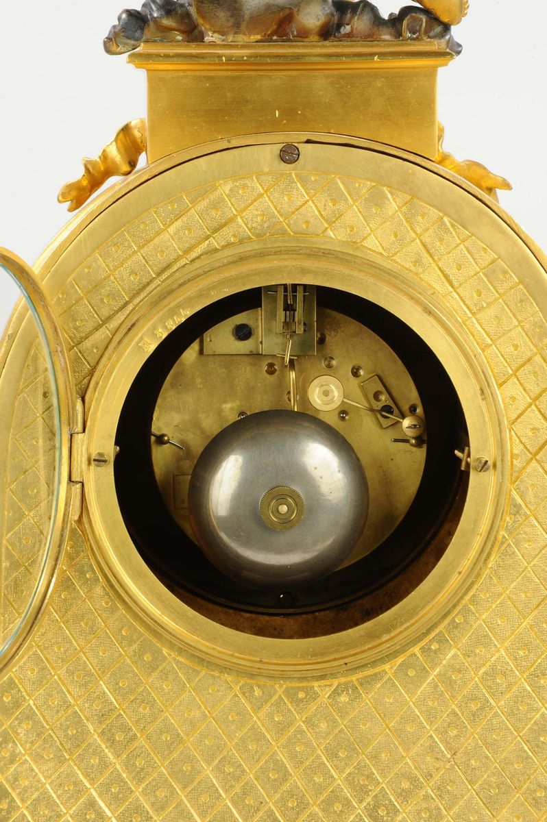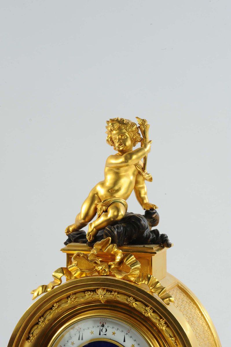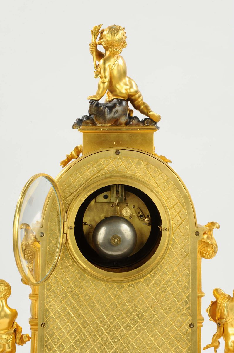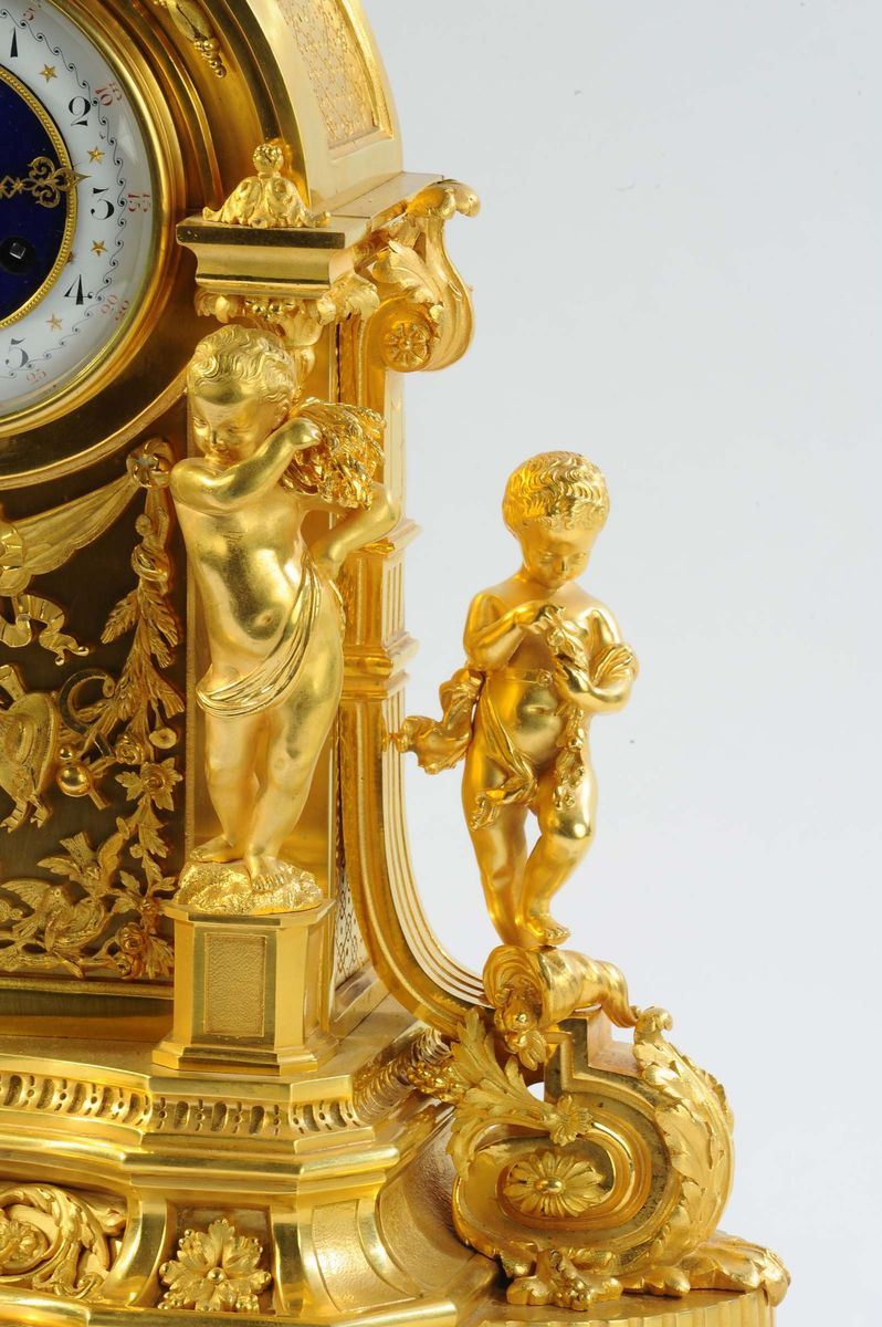 Di fronte, e ai lati della cassa, vi sono quattro Putti, ciascuno come allegoria dei cicli del raccolto e delle stagioni, mentre in apice un quinto putto regge una fiaccola.Al centro, collocato sotto al quadrante, un fregio raffigura un braciere vicino al quale vengono richiamati, con altre figure allegoriche, i cicli del raccolto. Quadrante, custodito da una ghiera con vetro, composta da una parte centrale in smalto blu su cui vi è la firma A Grinard / Rue de Turenne Paris, e una fascia esterna sulla quale sono dipinte le ore e la minuteria, suddivisa in quinti, a numerazione araba. Due lancette traforate a fantasia indicano le ore. Meccanica a scappamento ad ancora con sospensione a lamella e registro tramite chiavetta sul fronte; suoneria a ore e mezze al passaggio su campanello con leveraggio a cremagliera, carica settimanale, cm 43x21x62