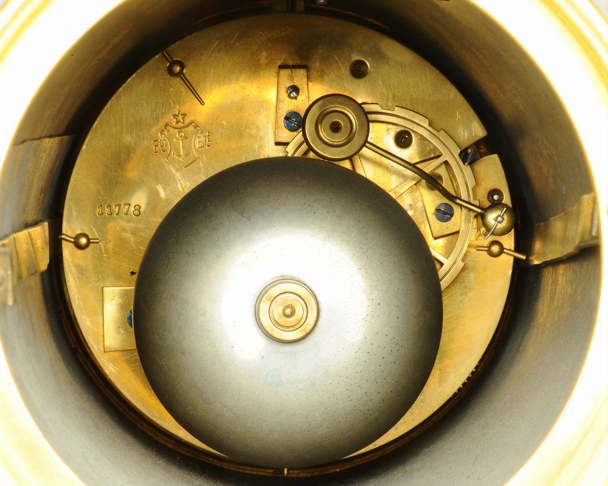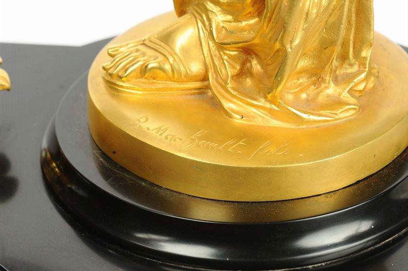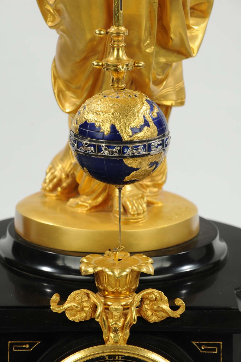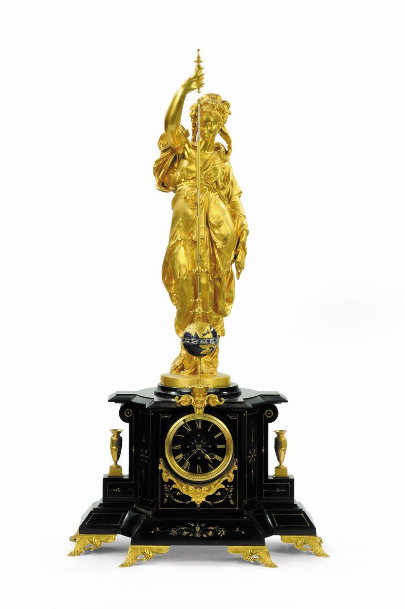 cassa in nero di Belgio con incisioni dorate poggiante su sostegni in bronzo dorato, sormontata da figura femminile in bronzo cesellato e dorato che sorregge pendolo a forma di globo terrestre recante fascia con segni zodiacali, meccanica francese a scappamento libero con pendolo conico, suoneria a ore e mezze al passaggio su campanello, cm 50x30x95