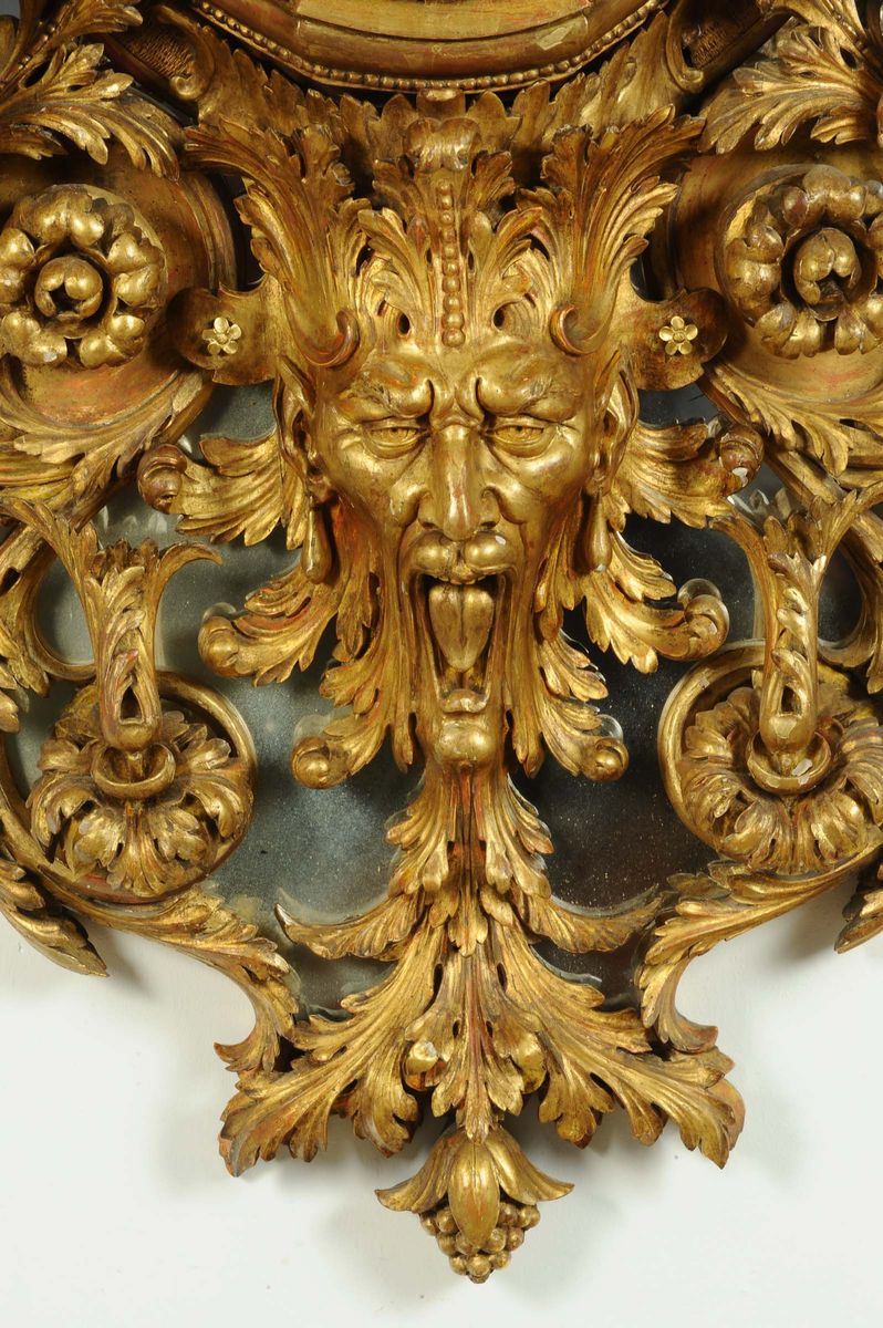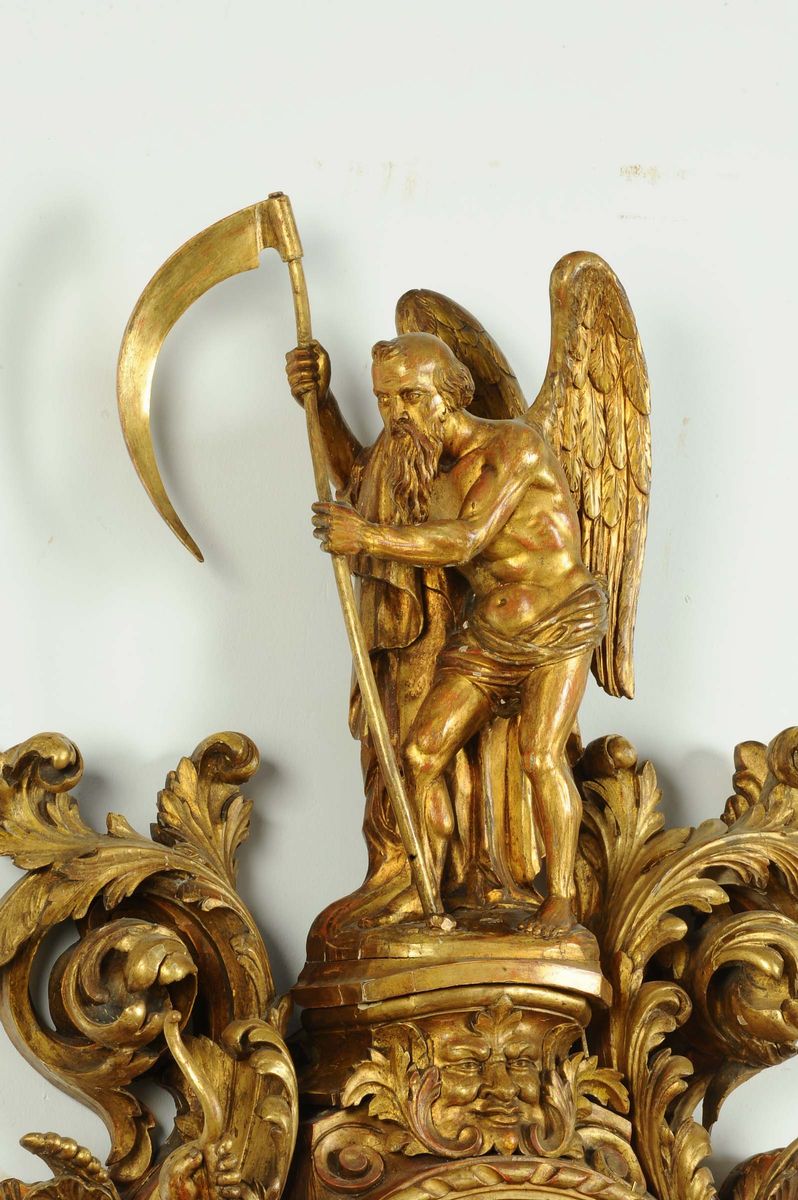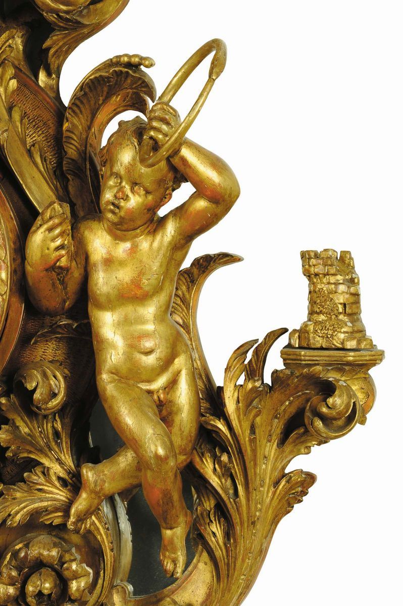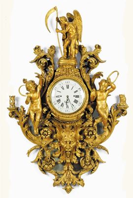 quadrante in smalto con numeri romani e arabi, lancette in ferro a fantasia, meccanica musicale inglese a conoide con scappamento ad ancora con sospensione a lamella, suoneria a carillon a ore e quarti al passaggio, cm 145x90Questo sorprendente e spettacolare orologio realizzato durante il periodo eclettico, offre un ricco repertorio di allegorie e simbolismi. Le molteplici volute, unite agli ornamenti, ghirlande e putti, rendono particolarmente ricca e unica quest’opera realizzata in legno intagliato e dorato a foglie d’oro. Sulla sommità dell’orologio troviamo Crono, figura della mitologia greca, Dio e titano del tempo, figlio di Urano e di Gea. Centralmente è collocato un mascherone di fattura rinascimentale che nasconde il pendolo dell’orologio. Sulle due volute laterali troviamo due putti, quello di sinistra sorregge nella mano destra una falce che simboleggia l’inesorabilità del tempo, nella mano sinistra sollevata verso l’alto un arco che simboleggia l’amore che vince sul tempo. Il putto di destra, sorregge nella mano sinistra un serpente che si morde la cosa (Uroburo) che rappresenta l’eternità e la continuità della vita. Sulla voluta di sinistra troviamo invece una clessidra che indica lo scorrere della vita, mentre sul lato destro troviamo una torre che simboleggia la fortezza dell’animo. Il meccanismo musicale con carillon di questo spettacolare orologio è di fattura inglese e nasce per questo orologio. Non di rado, in Austria erano utilizzate meccaniche importate da altri paesi per la realizzazione di particolari orologi, probabilmente in questo caso, considerando l’unicità dell’opera, la sua qualità esecutoria e la sua unicità, il commettente (o chi lo realizzò) decise di inserire una meccanica di elevata qualità comprensiva di meccanismo musicale per renderlo ancora più interessante e senza uguali.Extraordinary gilt wood cartel, sumptuous in size and eclectic style, with English-made clock with carillon, Austria, circa 1850.This surprising and spectacular clock made during the eclectic period offers a rich repertory of allegories and symbolisms. Its many volutes and ornaments, garlands and cherubs, give particular richness and uniqueness to this work in carved wood and gold leaf.On the summit of the clock is Chronus, from Greek mythology: a Titan and god of time, the son of Uranus and Gaia. In the centre is a Renaissance mask hiding the clock’s pendulum. On the side volutes are two cherubs: in the right hand of the one on the left is a scythe, symbolizing time’s inexorability, and in his left he is holding up a bow, symbolizing love that conquers time. In the left hand of the cherub on the right is a serpent biting its tail (Uroburos) representing eternity and continued life.On the left volute we instead find an hourglass indicating life slipping away, while on the left is a tower symbolizing the fortress of the soul.This spectacular clock’s carillon is of English manufacture and was created expressly for it. Austria not infrequently made use of imported mechanisms to make special clocks, and probably in this case, considering the uniqueness of the work and its splendid manufacture, whoever commissioned (or made) it decided to include very high quality mechanisms along with a musical one to make it even more fascinating and exceptional.