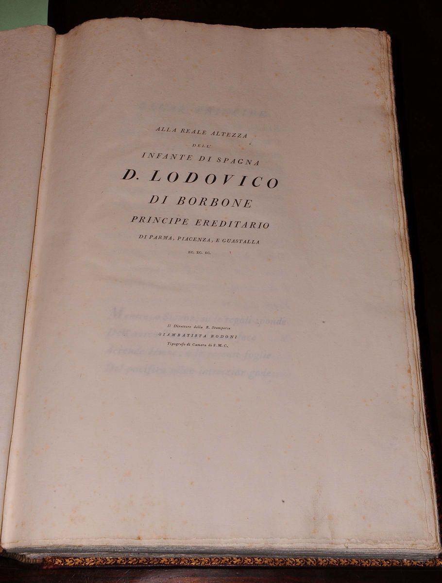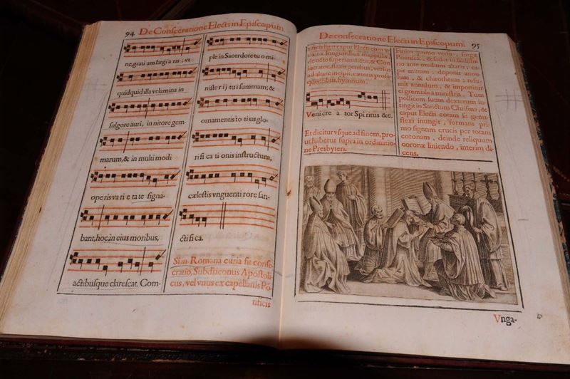 3 volumi in folio, sontuose legature in marocchino rosso con stemma vescovile al centro dei piatti. Prima edizione di questo splendido libro pontificale, impresso dal libanese maronita Giacomo Luca, accompagnato da 155 incisioni.Bibliografia: Brunet, IV, 814. Graesse, V, 409.