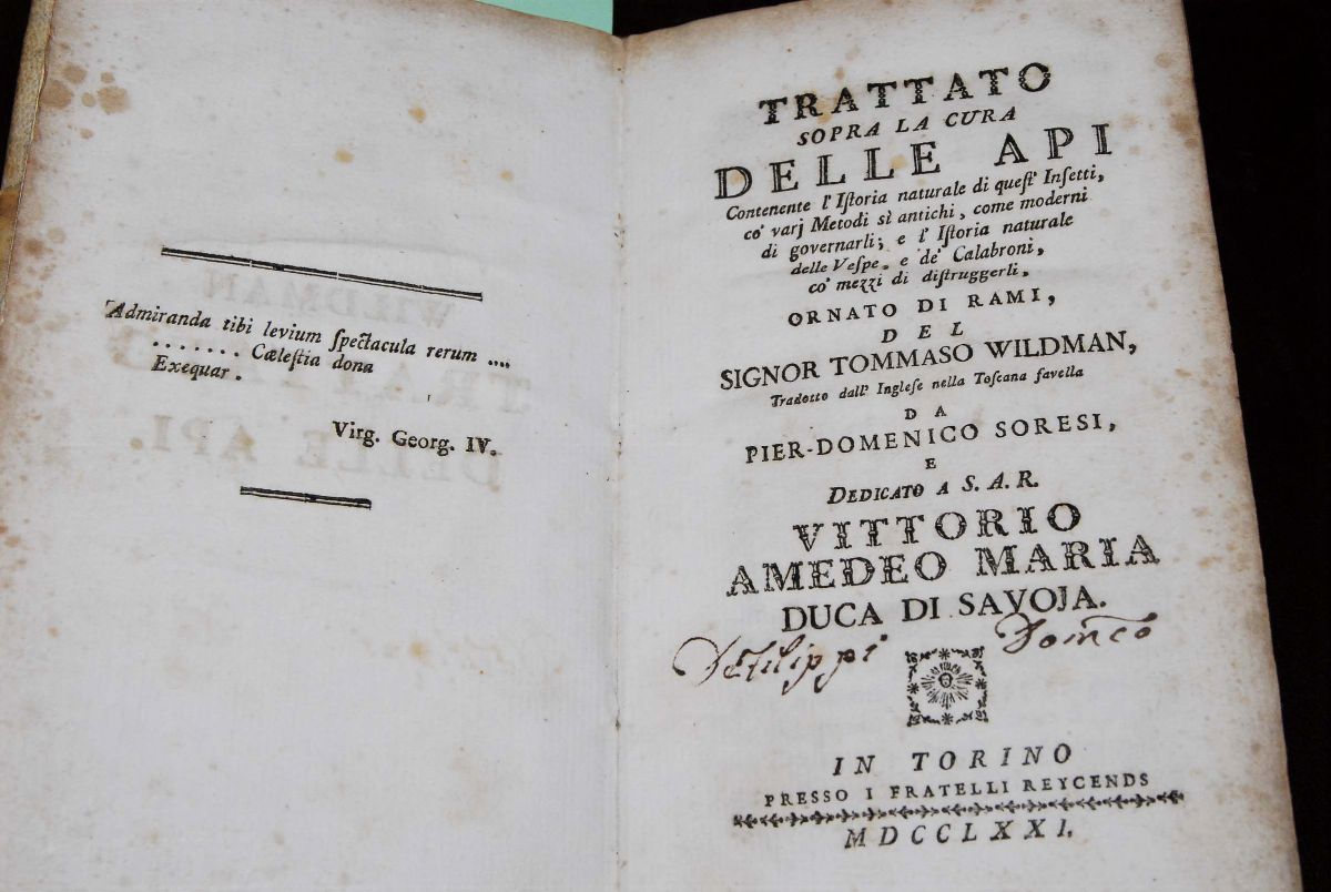 Trattato sopra la cura delle api contenete l'istoria naturale di quest'insetti, co' varj metodi si antichi, come moderni di governarli ... ornato di rami. In Torino, presso i Fratelli Reycends, 1771.