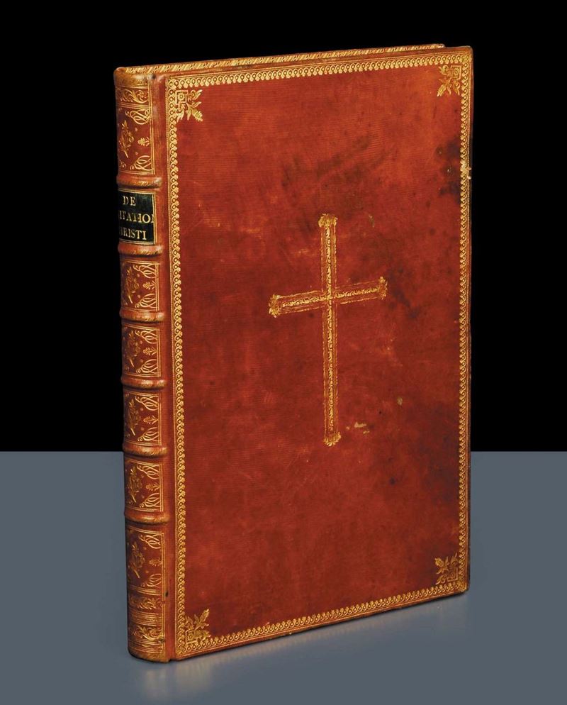 In-folio, splendida legatura in tutto marocchino rosso a grana lunga. Dorso a nervi riccamente ornato in oro, tassello, tagli in oro, piatti inquadrati da filetto in oro e fregio floreale accantonato. Bellissimo esemplare da raffinata collezione. Bibliografia: Brooks, n. 484 ; De Lama, v. 2, p. 80-8