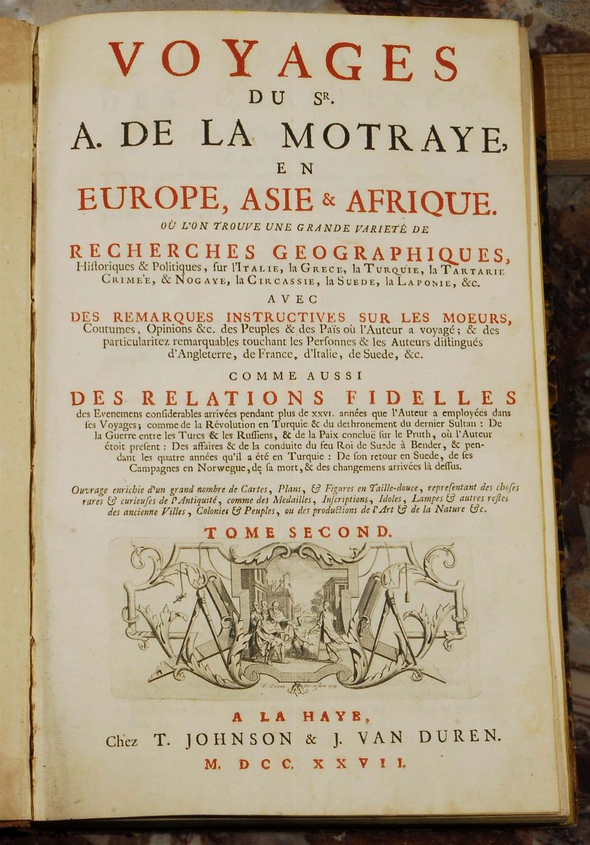 Voyages du Sr. A. de La Motraye, en Europe, Asie, & Afrique. Oú l'on troue une grande variete de recherches geographiques, historiques & politiques, sur l'Italie, la Grece, la Turquie, ... Come aussi des relations fidelles des evenemes considerables arrivées pendant plus de 26. années que l'auteur a employées dans les voyages, ... Tome premier-second A La Haye, chez T. Johnson & J. Van Duren, 1727.