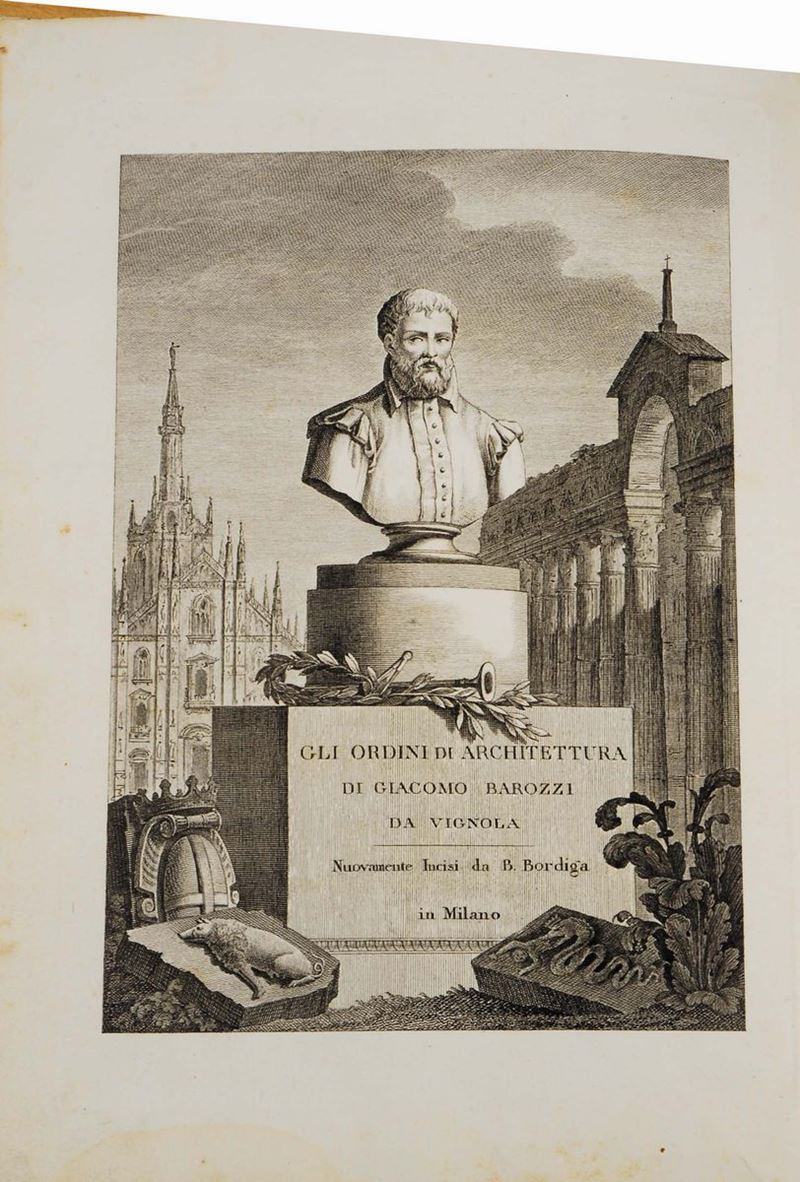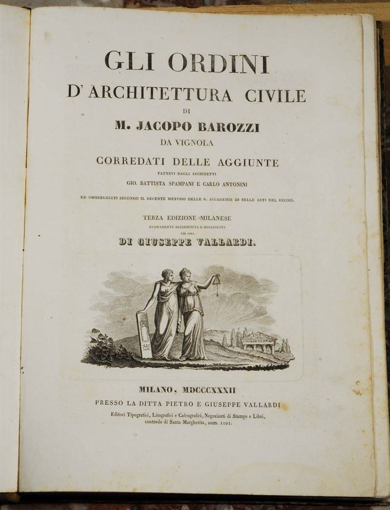 BRANCA Giovanni, Manuale d'architettura corretto ed accresciuto, Roma, s.e., 1772. In-12, legatura in mezza pelle coeva, con tavole n.t. a piena pagina. BAROZZI da VIGNOLA, Ordini di architettura, Milano, Vallardi, 1832. In-folio, legatura coeva in mezza pelle, con tavole incise fuori testo in fine.