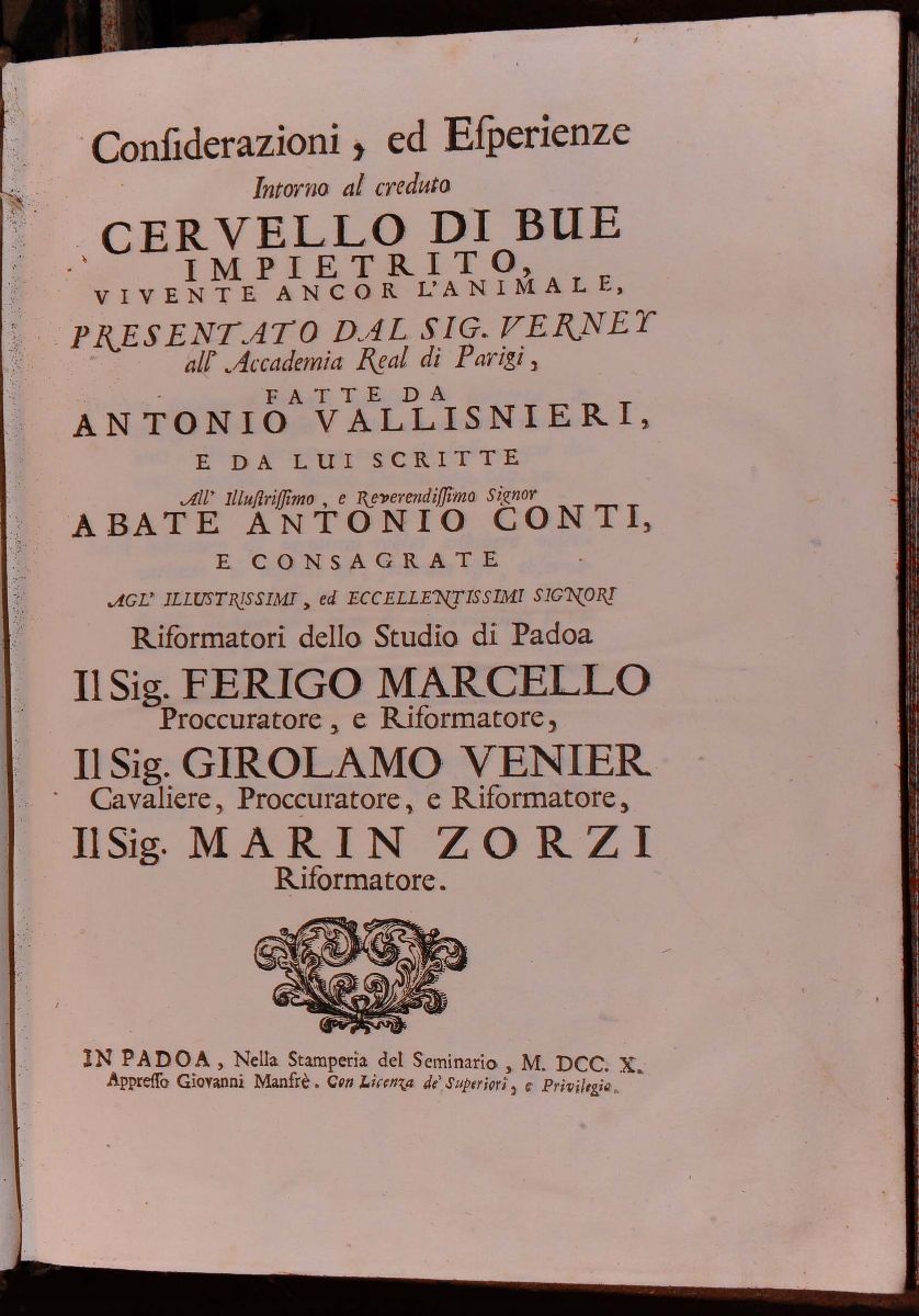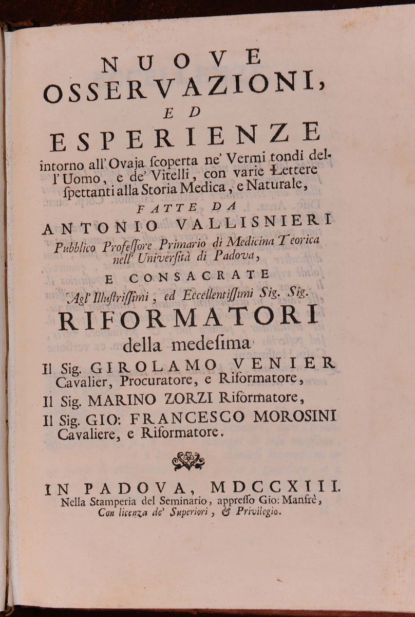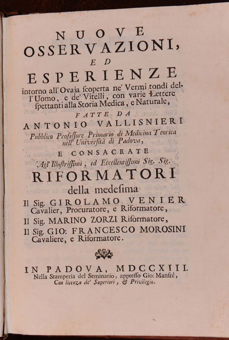 Lotto di 4 divese opere di Vallisneri con legature uniformi in piena pelle coeva e fregi al dorso. Mancanza di tassello a un dorso.