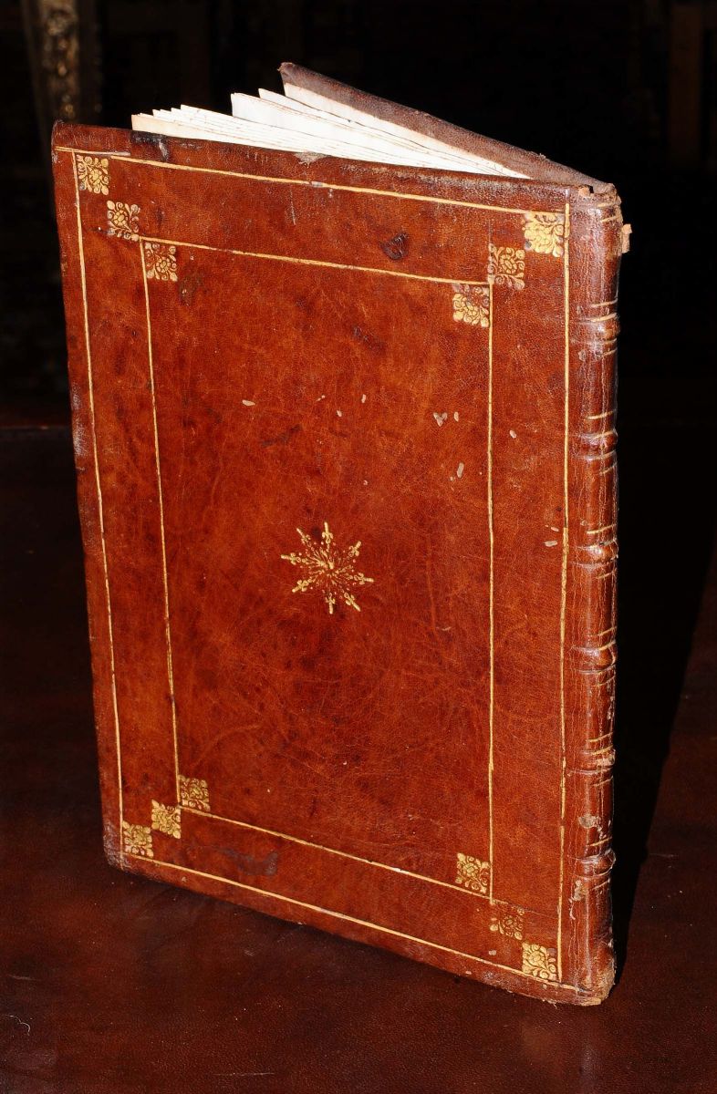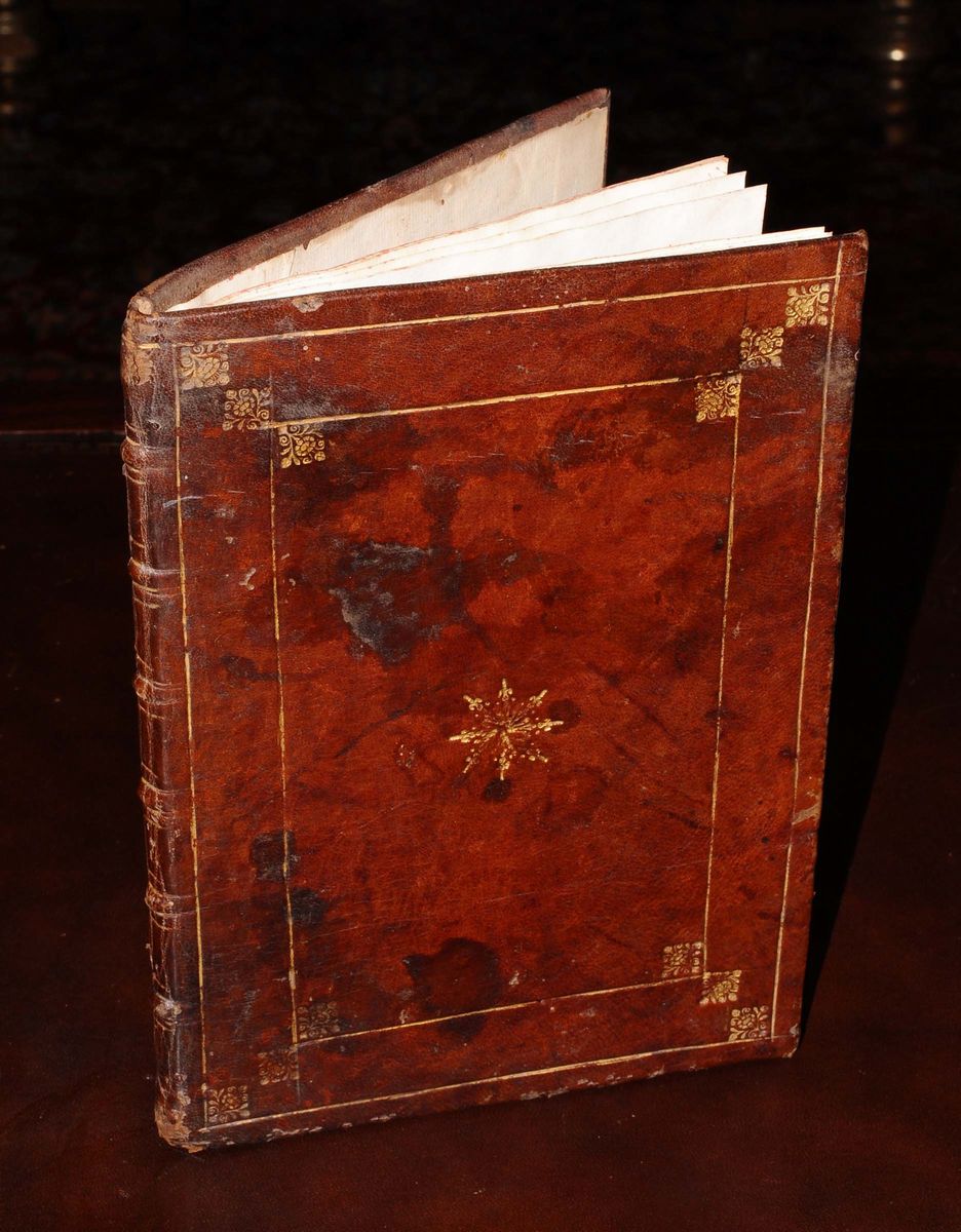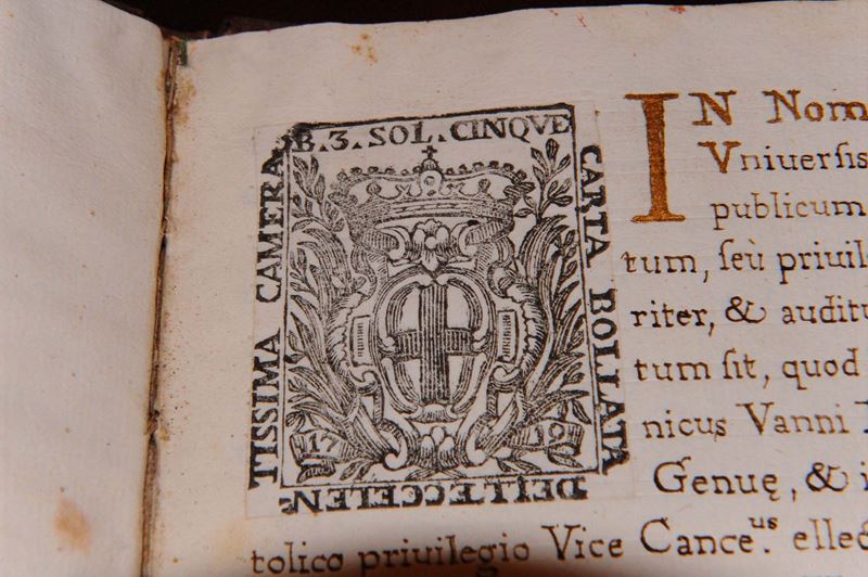 Manoscritto su carta di 13 cc. non numerate vergato in inchiostro ocra e oro. Timbro sotto carta e sottoscrizione autografa in fine del cancelliere del Venerando Collegio di Legge di Genova. Bella legatura coeva in piena pelle con piatti inquadrati da filetti in oro.
