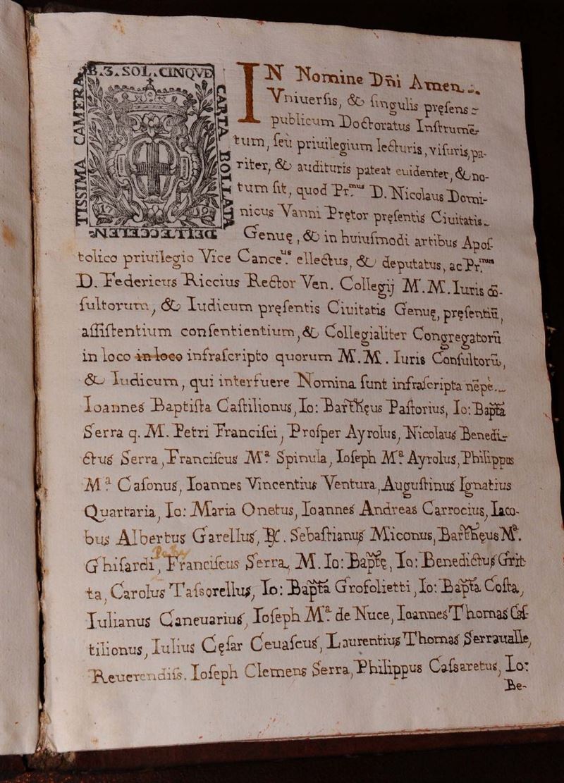 Diploma di laurea rilasciato a Giovanni Battista de Rubeis di Albenga. Dato in Genova [in ecclesia catedrali Sancti Laurentii], 1722.