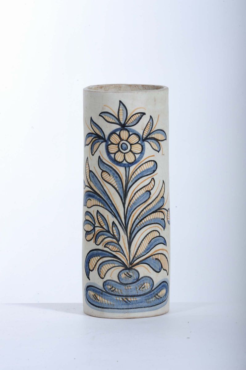 Albarello cilindrico in terracotta maiolicata, Spagna la Mendra Tavalera