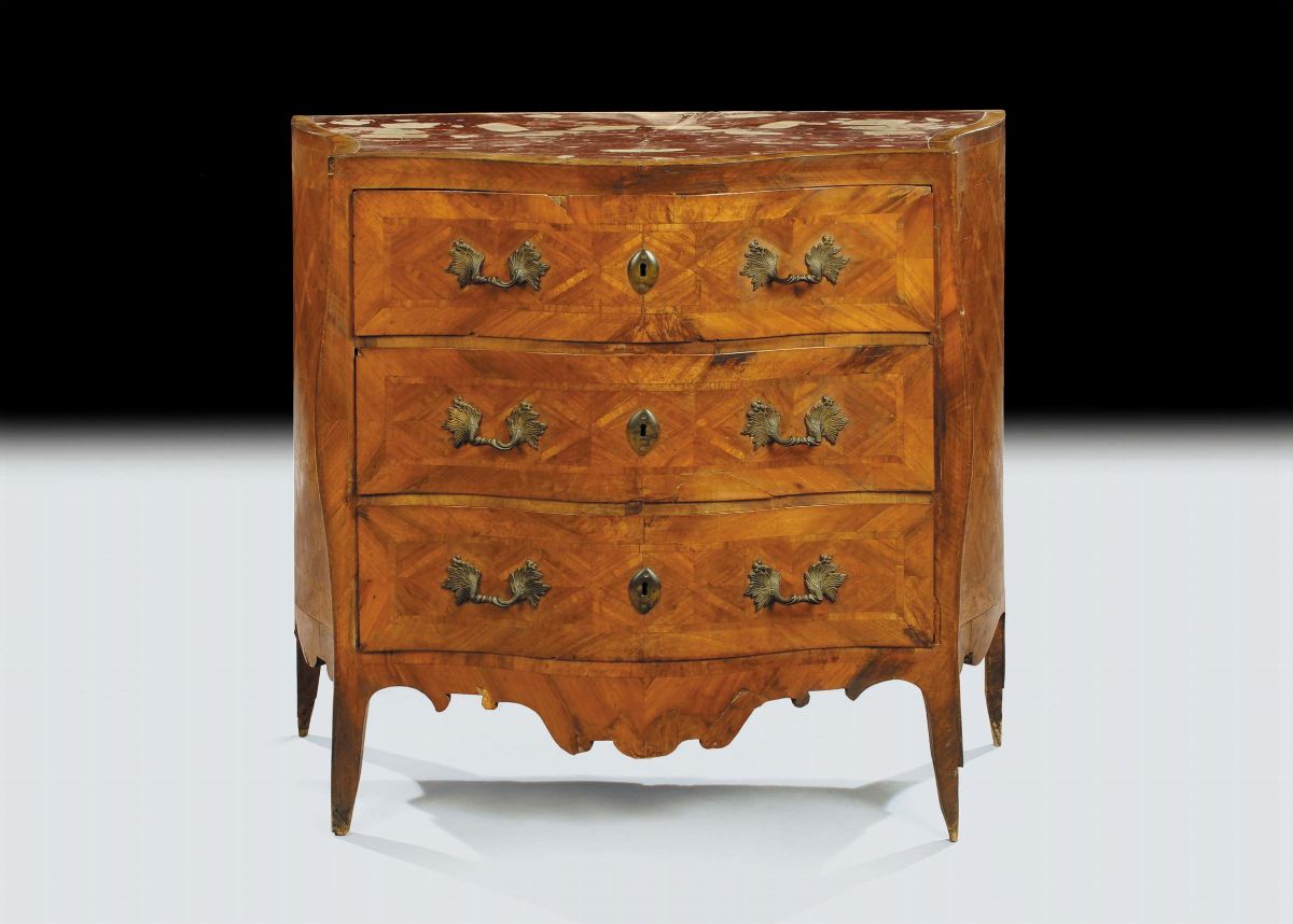 piano incassato in marmo rosso. La parte frontale leggermente mossa, presenta tre cassetti separati da traverse e decorati a marqueterie geometriche, spigoli prominenti e grembiale a volute contrapposte, cm 94x49x86