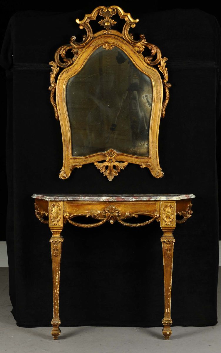 due gambe troncopiramidali, piano in marmo, specchiera dorata intagliata a motivo floreale e vegetale, cm 99x30x85, altezza specchiera cm 104