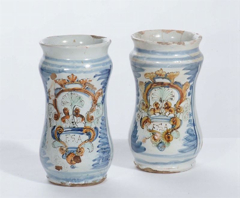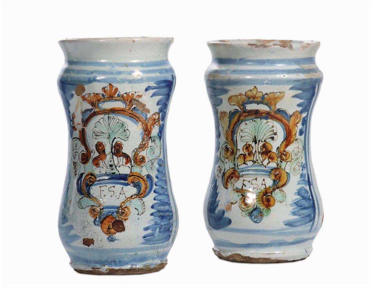 Coppia di albarelli in maiolica, Napoli XVIII secolo