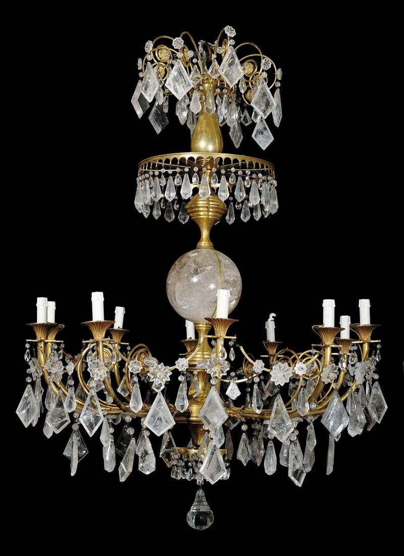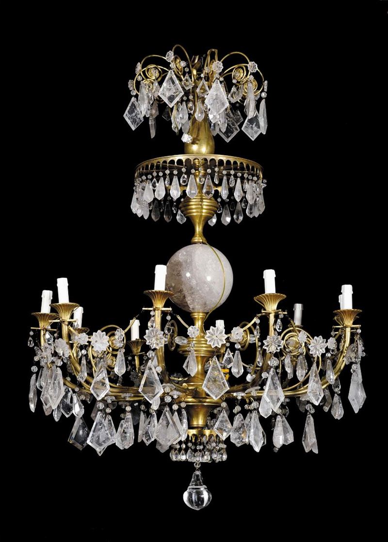 Coppia di lampadari in bronzo dorato ornati da pendenti e rosette in cristallo di rocca, XIX secolo