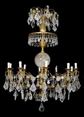 dieci luci disposte su un unico ordine di bracci bronzei arcuati decorati con riccioli centrati da rosette, grande sfera in cristallo lungo il fusto centrale sovrastata da corona di pandenti e altra cerchia di riccioli, altezza cm 130, diametro cm 90
