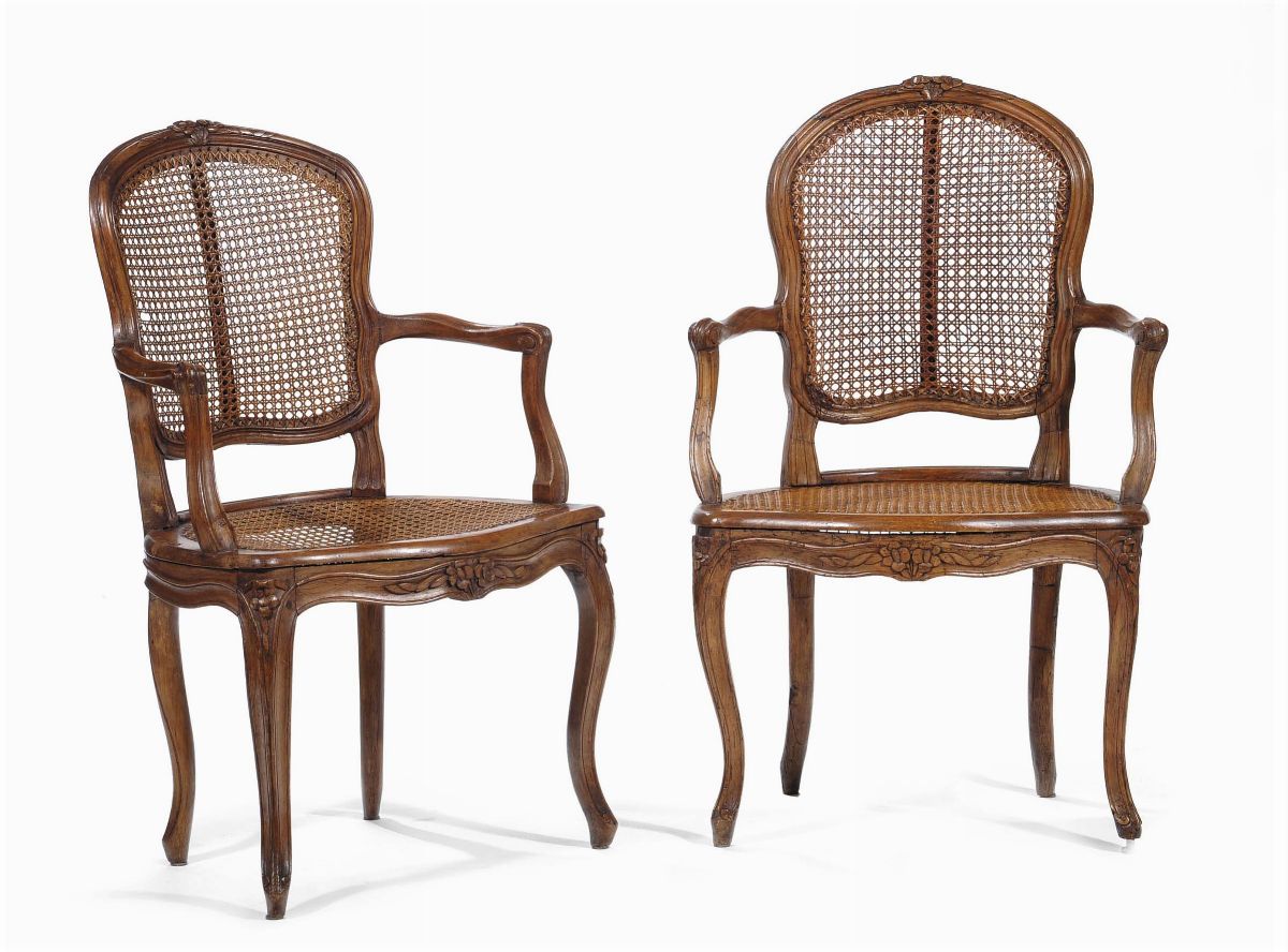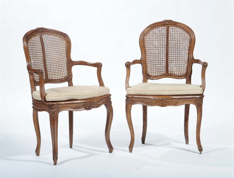 Coppia di poltroncine Luigi XV in rovere, Francia XVIII secolo