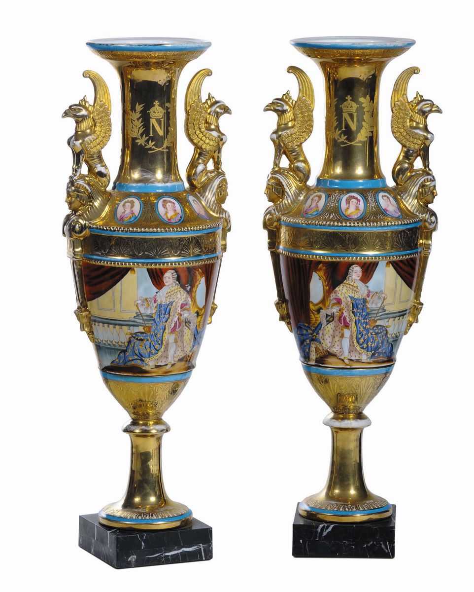 Coppia di vasi Impero a fondo oro con manici a grifoni, XIX secolo