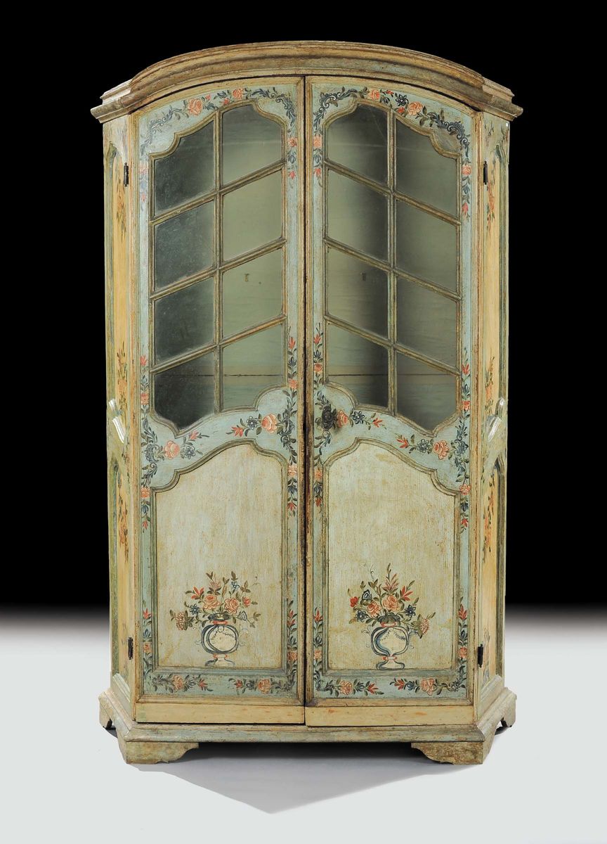 Coppia di vetrine laccate nei toni del crema e del verde tenue con decori floreali policromi