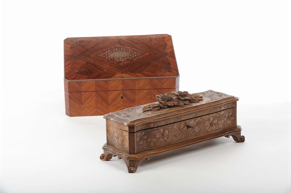 una in legno intagliato a motivo floreale, cm 34x13x14 e una lastronata, cm 30x20x12